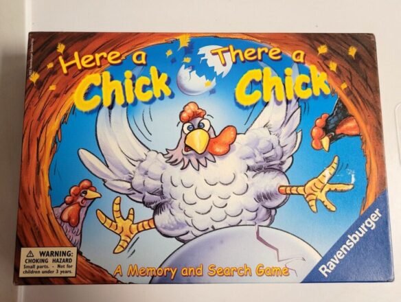 Here a Chick, There a Chick is a great board game from Ravensburger. The game includes 18 hen tokens and 18 plastic stands, 36 nests (18 with one egg, 12 with one chick, and 6 with two chicks), 9 feather tokens, and an instruction booklet.