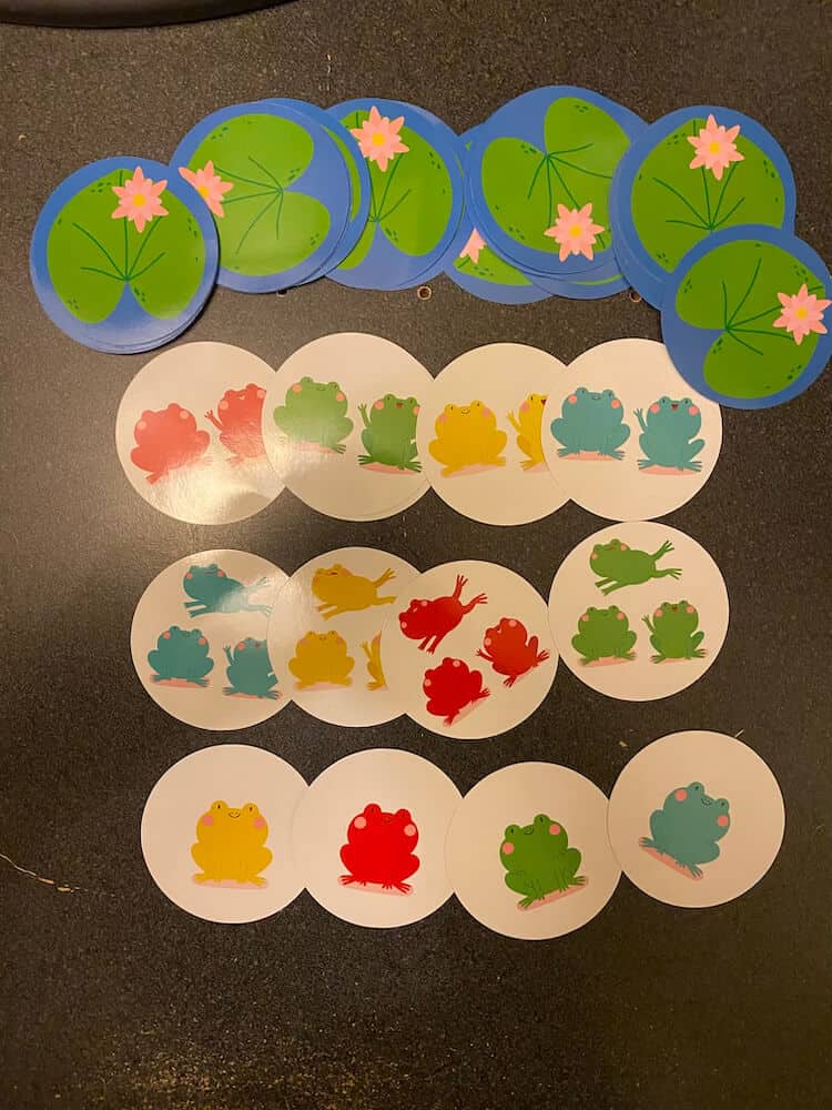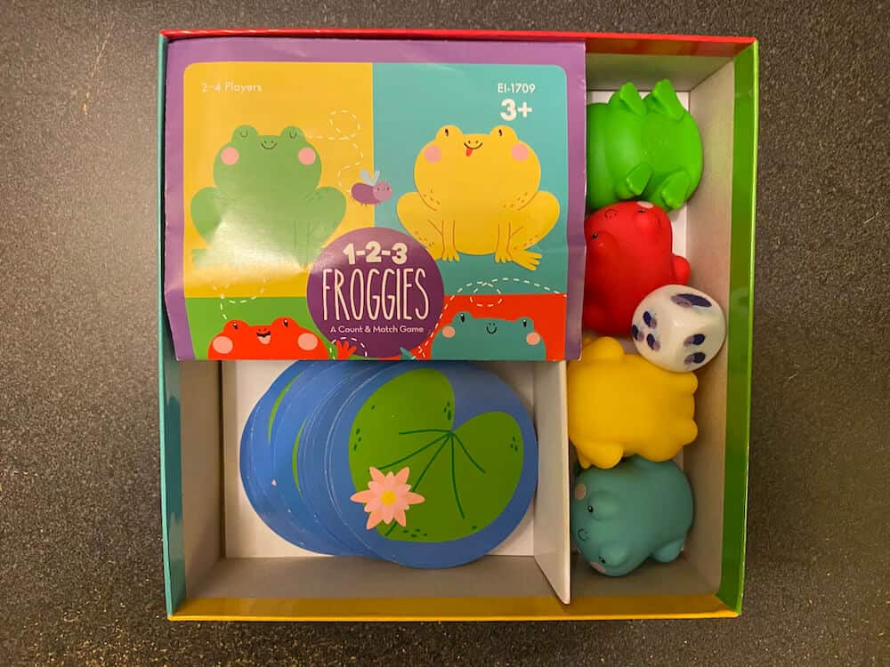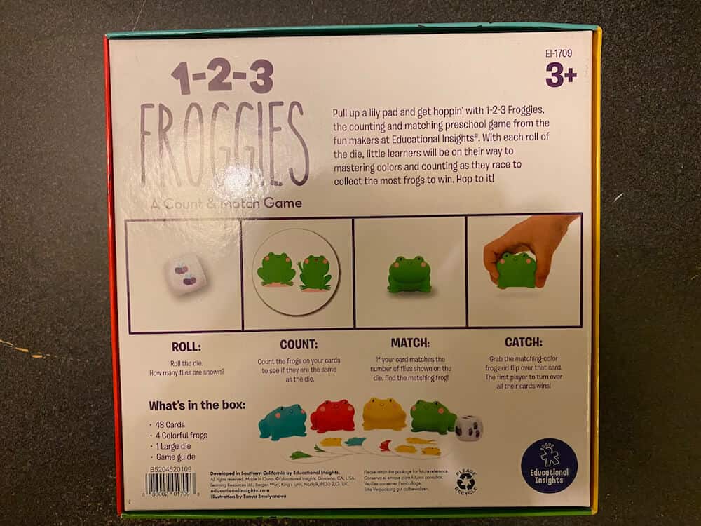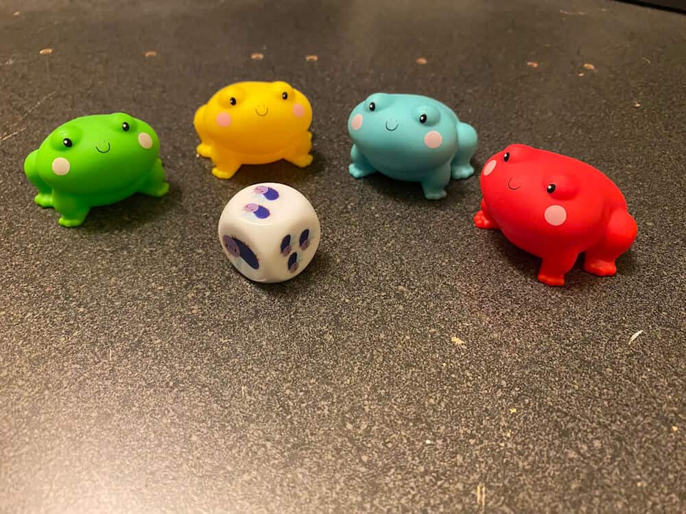 Get ready to count with 1-2-3 Froggies, the fly-catching, froggy-matching, colorful counting game for preschoolers! Roll the die, noting the number of flies shown, then race to scan your cards and find one with the same number of frogs. Make a match and grab the matching-colored Froggy first to win the round AND score some serious early learning skills. Using this game reinforces color learning, practices memory and attention skills, and encourages social skills and turn-taking. This pre-used game includes 43 (of 48) Lily Pad Cards, 4 Colorful Frogs, 1 Large Custom Die, and instructions in English, Spanish, French, and German. This game can be used by occupational therapists, speech language pathologists, and special education teachers.