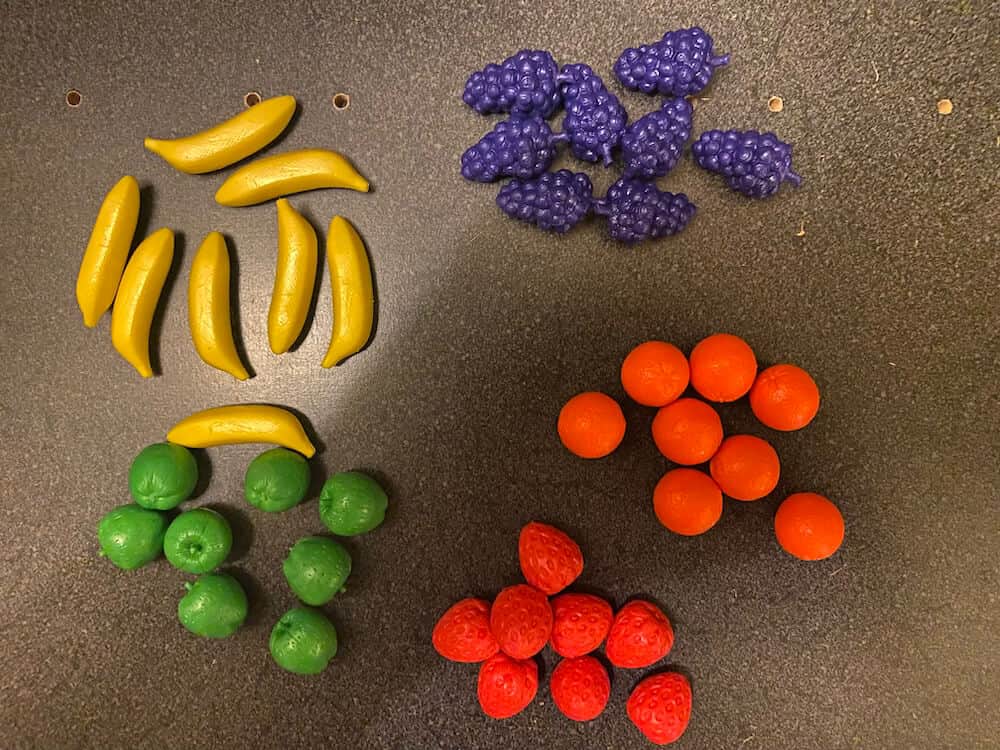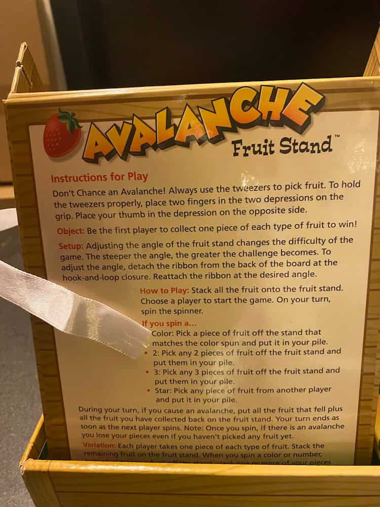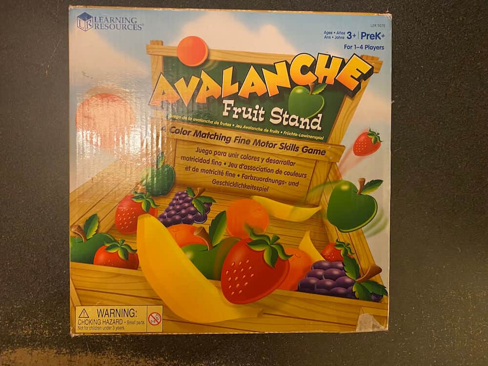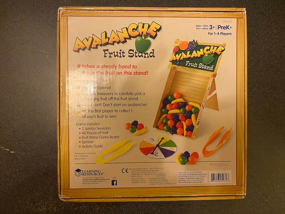 The Learning Resources Avalanche Fruit Stand Tweezer Game is an educational toy designed for young children to develop fine motor skills and hand-eye coordination. The game includes a set of tweezers and 40 fruit pieces in different colors and shapes. The objective of the game is to use the tweezers to pick up and sort the fruit pieces before the avalanche strikes. It is recommended for children aged 3 and up. This pre-used game contains 1, Angled Fruit Stand Tray, 2 Jumbo Tweezers, 40 Fruit Pieces (8 each of Grapes, Oranges, Strawberries, Bananas, and Green Apples). MISSING: 1 Spinner, and Activity Guide. This game can be used by occupational therapists, speech language pathologists, and special education teachers.