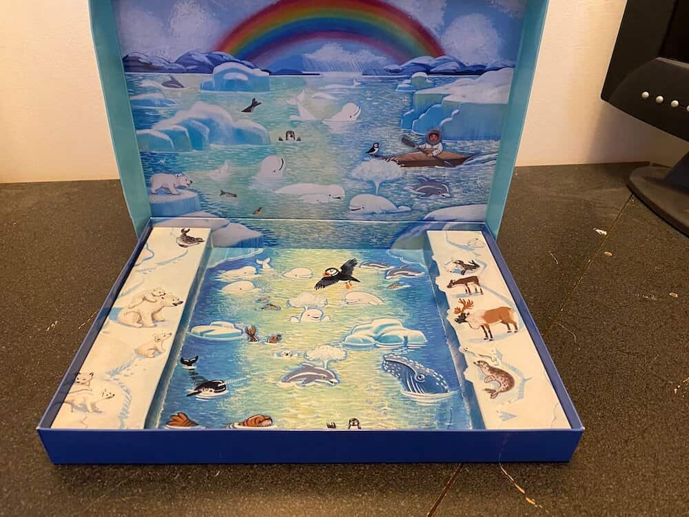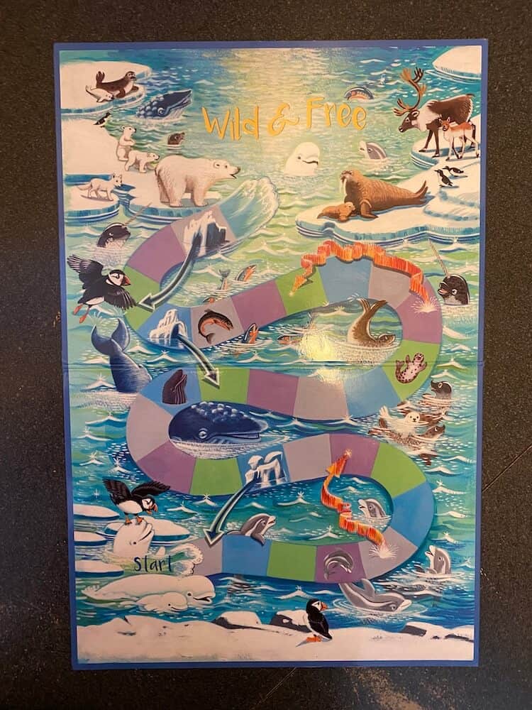 Baby Beluga (from the song by Raffi) is a charming, cooperational play board game. Wooden game pieces, original watercolor art by Ashley Wolf, plus an innovative game box design that makes a diorama (from the cover and bottom) of the Arctic that will awe children of all ages. Made in the USA, fair trade, sustainable, child safe. Added features include our illustrated 32-page guidebook with simple game directions, Ocean Science Pages, and directions for more active cooperative games.