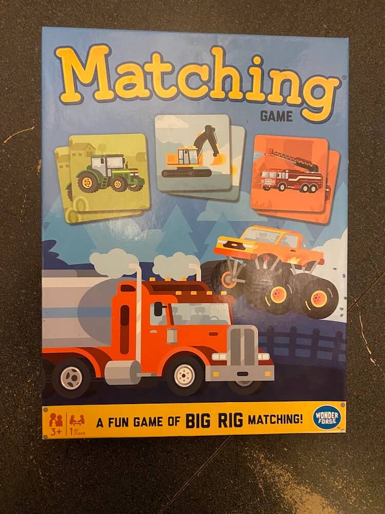 The Big Rig Matching Game from Wonder Forge. The large, extra thick cards are perfect for little hands to work with as they hunt for the matching pairs. This pre-used game contains 72 cards depicting colorful construction vehicles, fire trucks, tractor trailers, and more, that make 36 matching pairs, and instructions. Play this game as a traditional matching game, laying the pieces face down in a grid format. Take turns turning over tiles two at a time. This helps with matching and memory skills as well as visual acuity to recognize the different big rigs. This game encourages matching, memory, visual discrimination. This game can be used by occupational therapists, speech language pathologists, and special education teachers.