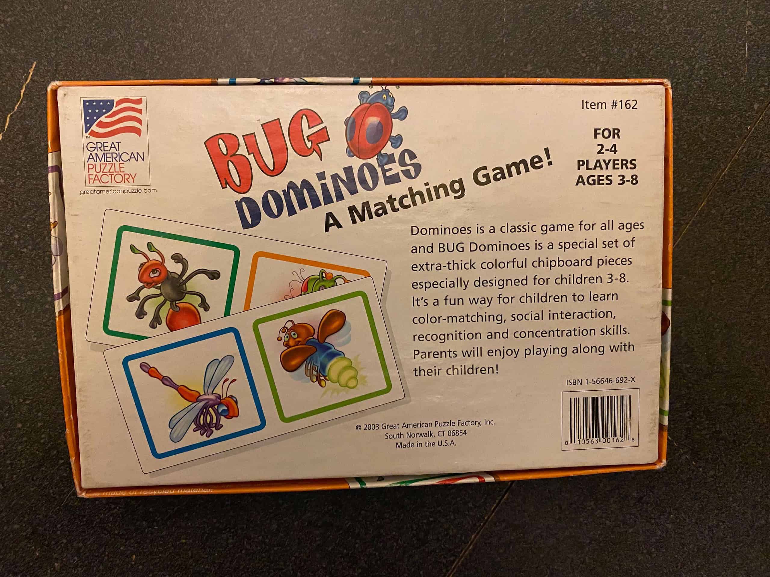 Bug Dominoes is a new variation of the classic dominoes, with extra-thick, colorful chipboard pieces – ideal for young kid’s fingers. A fun way to learn color matching, social interaction, visual acuity, recognition, and concentration skills. This pre-used game includes 28 Bug Dominoes and instructions. This game can be used by occupational therapists, speech language pathologists, and special education teachers.