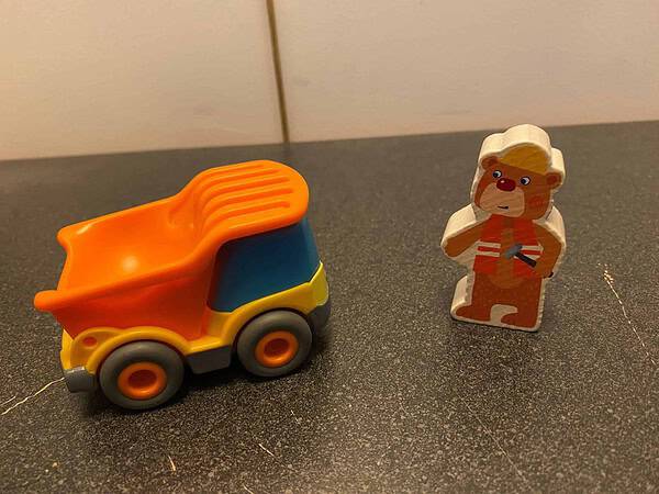 Made by HABA in Germany, a name I trust for quality products. This pre-used game includes 1 wooden figure of the site manager (Bruno Bear), 1 plastic dump truck, 1 construction plan (2 pieces that fit together), 1 2-sided building site (2 cardboard pieces that fit together), 4 wooden blocks (gray foundation, orange brickwork, red roof, and green shrubbery), 4 cardboard storage areas (these correspond to foundation, brickwork, roof and shrubbery), 11 (of 12) 2-sided traffic cones tiles, and rulebook (instructions). This game can be used by occupational therapists, speech language pathologists, and special education teachers.