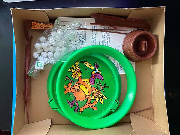 This pre-used game contains 1 upper ring, 1 lower ring (base), 3 brown supports, 1 tree base, 1 bird with feather, 6 support sticks, 24 white eggs (marbles), game die, and instructions. Incorporate vocabulary and articulation cards to improve speech and language skills. This game can be used by occupational therapists, speech language pathologists, and special education teachers.
