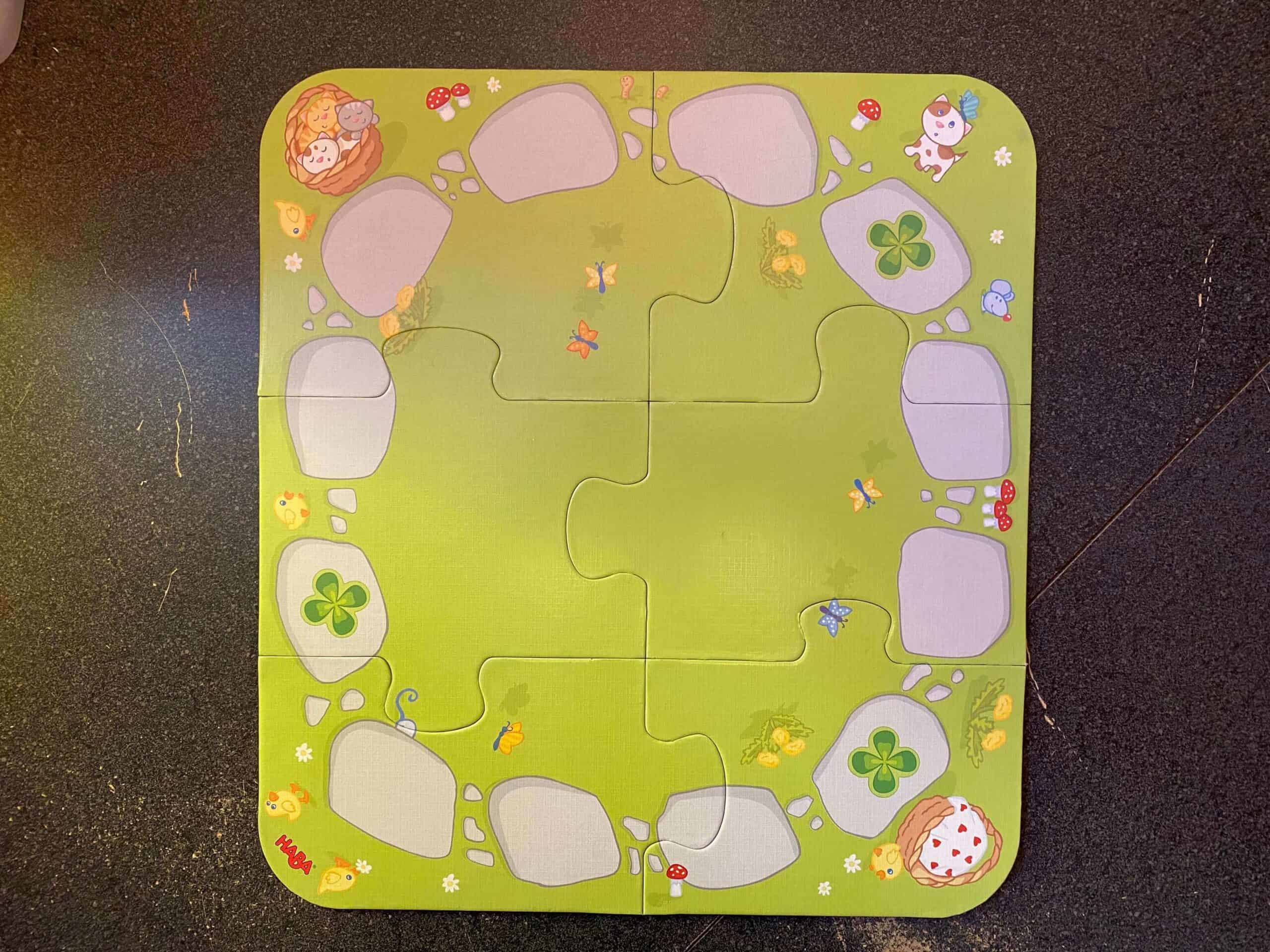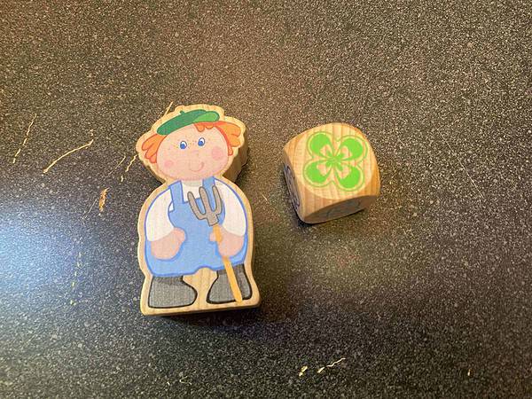 Help Farmer Tim count his Animal kids (piglets, calves, foals, and lambs) across the gameboard and feed them cloverleafs to help them grow. This pre-used game contains 1 Gameboard (assembled from 6 pieces), 1 Wooden Farmer Tim, 12 wooden Cloverleafs, 12 Animal Kid tiles, 1 Wooden Die, and instructions (in English and Spanish). This game stimulates Free Play, First understanding of rules, and Counting within the number range of 1 to 10. This game can be used by occupational therapists, speech language pathologists, and special education teachers.
