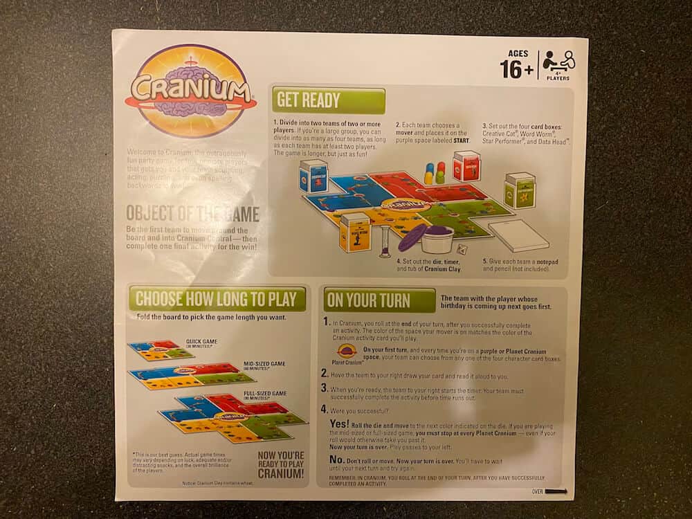 Cranium is a popular board game that combines elements of different games, including charades, Pictionary, trivia, and word puzzles. Cranium is a fun and interactive game, a great way to exercise your creativity, knowledge, and performance skills!