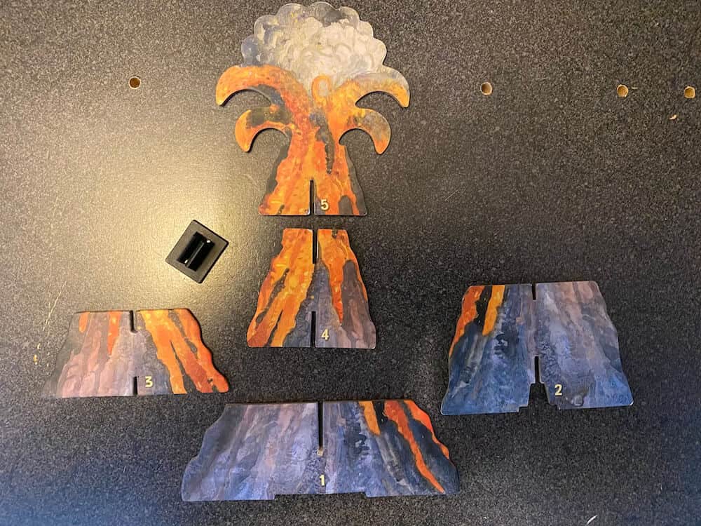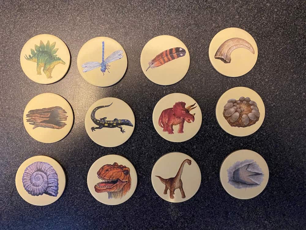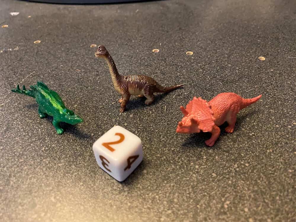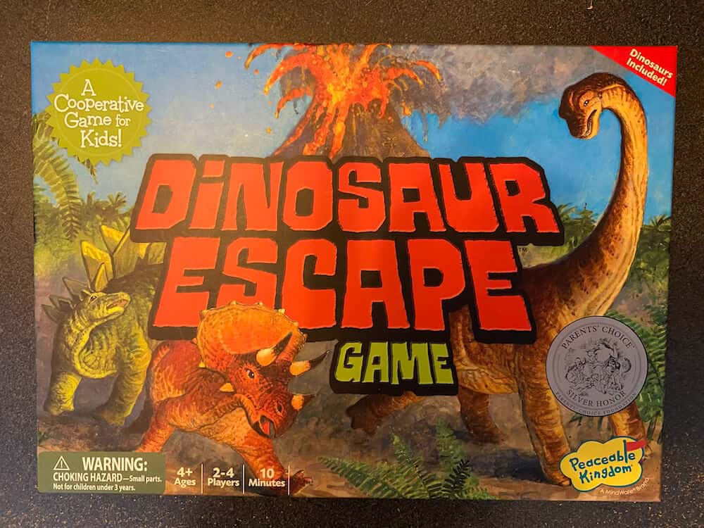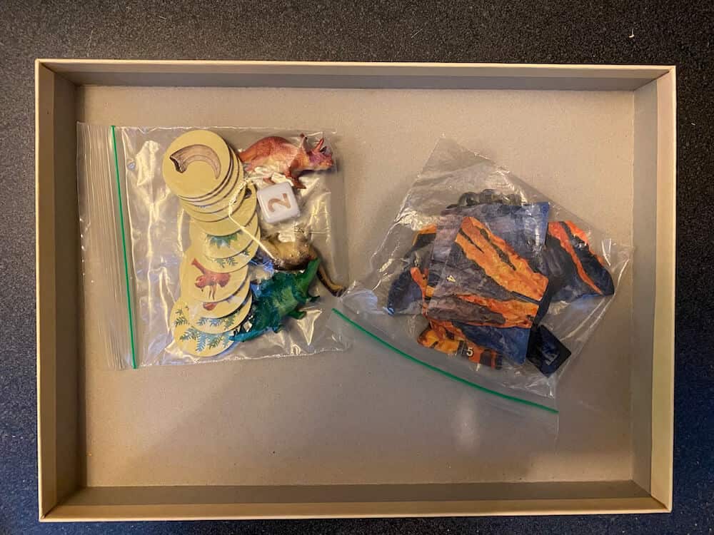Three dinosaurs are lost in the ferns and a volcano is threatening to blow! Uncover the matching dinosaurs under the fern tokens to rescue all three dinosaurs. Get the dinosaurs safely to the island before the volcano erupts and everyone wins! Playing this game encourages cooperation, improves memory, and enhances strategic thinking. Dinosaur Escape allows kids to learn to take turns and play cooperatively, and improve counting, memory and strategy skills. This pre-used game includes 1 Gameboard, 1 Custom Die, 3 Dinosaur Miniatures, 12 Fern Tokens and 5-pc Volcano. This game can be used by occupational therapists, speech language pathologists, and special education teachers.