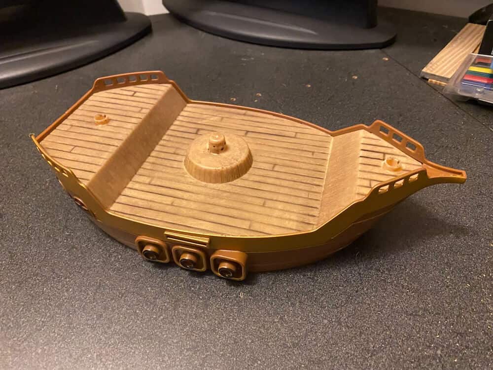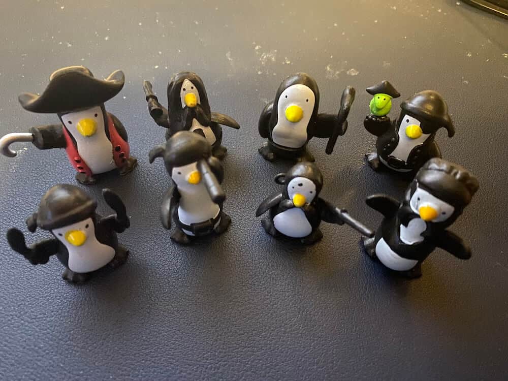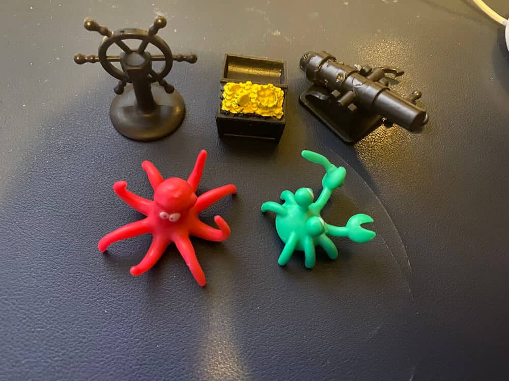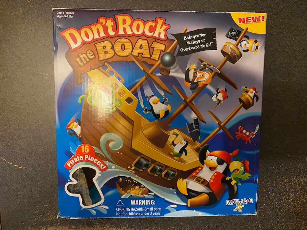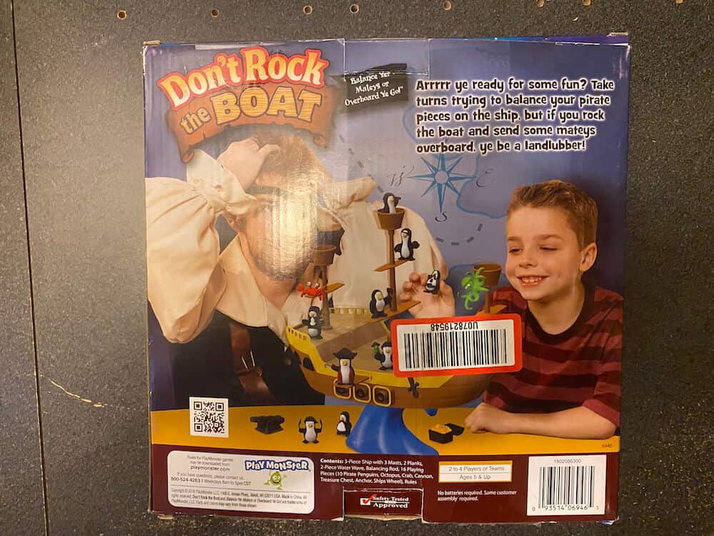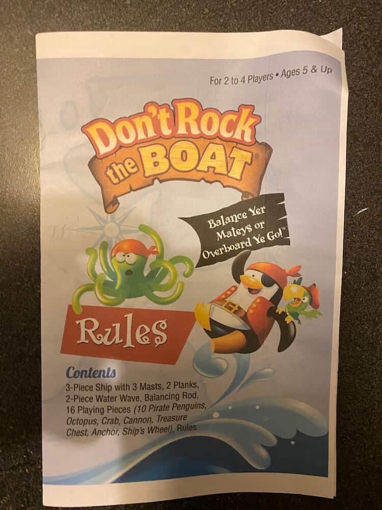Balance the Boat (with 3 masts affixed) on the Wave fulcrum. Divide the 16 pirate penguins according to the number of players. The object is to balance your pirate penguins on the boat without making it tip. Players take it in turns to place their penguins standing up on the boat, wherever they wish. As soon as the boat rocks and one (or more) penguins fall over the game, or round, ends. The last player before the player who rocked the boat is the winner. This pre-used game includes 1 Ship, 3 Masts, 1 Wave (fulcrum), 14 pieces (8 (of 10) Pirate Penguin figures, 1 Octopus, 1 Crab, 1 Cannon, 1 Treasure Chest, 1 Anchor, 1 Ship’s Wheel), and instructions (photocopy). This game can be used by occupational therapists, speech language pathologists, and special education teachers.