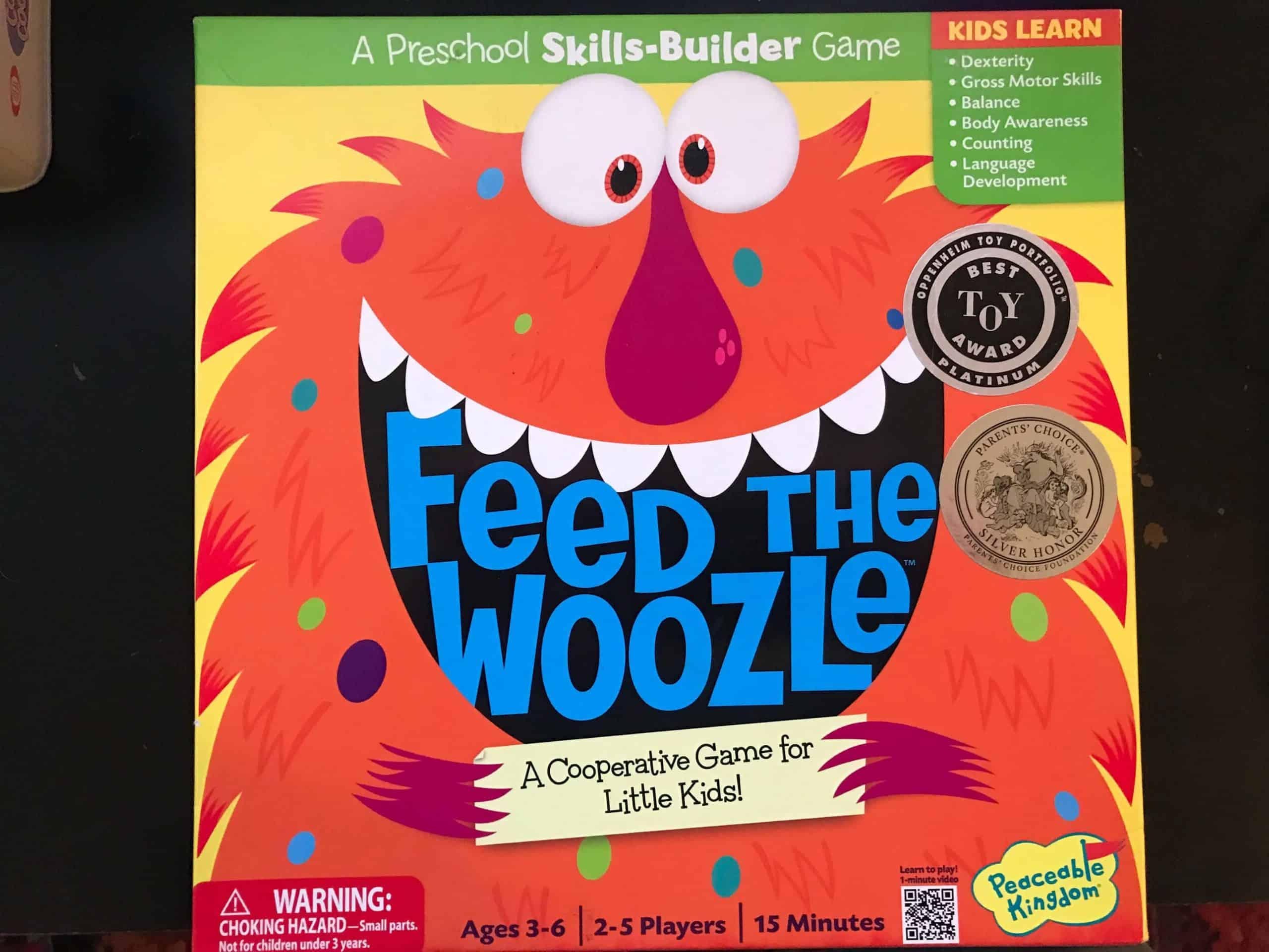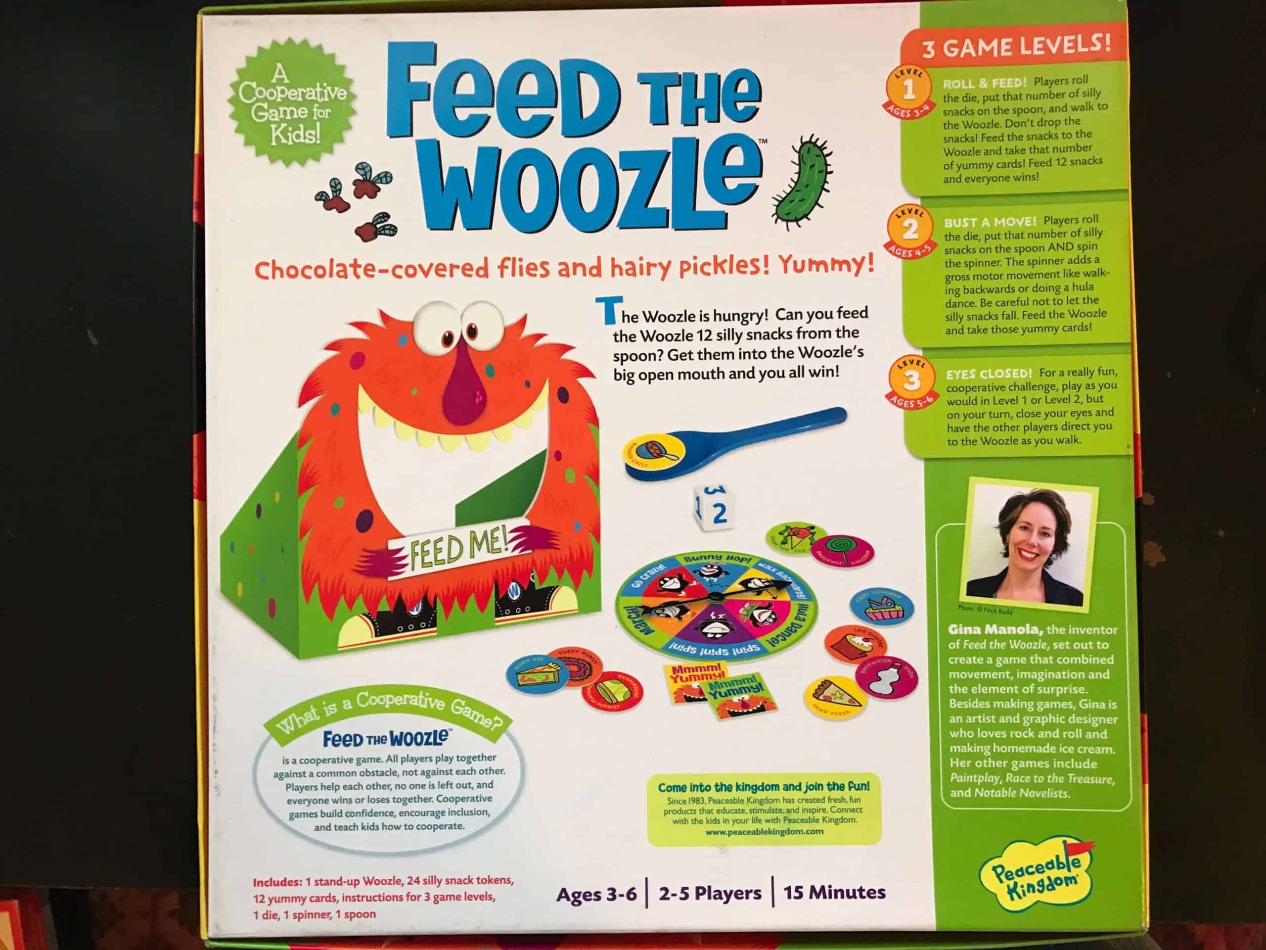 Chocolate-covered flies and hairy pickles? Yummy! The big-mouthed Woozle is hungry. Can you feed him 12 silly snacks from the spoon before all the snacks are gone? Play together, work together and have some monstrous fun. Feeding the Woozle is active and fun while allowing kids to be aware of their own bodies. This pre-used game includes 1 stand-up Woozle, 24 silly snacks, 12 yummy cards, 1 die, 1 spinner, 1 spoon and instructions for 3 game levels.