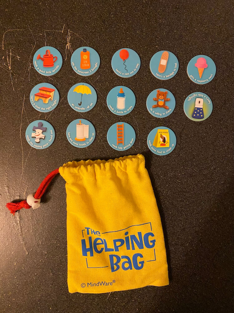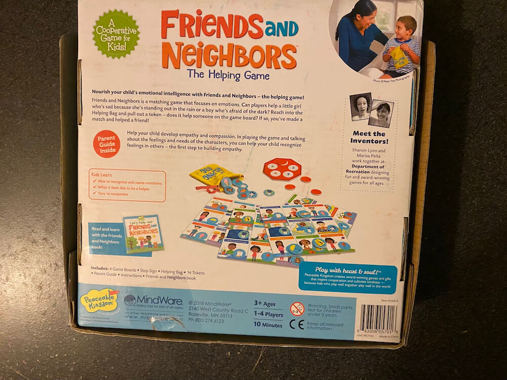 Playing this game helps develop empathy and emotional awareness, cooperation and teamwork, problem-solving, communication, social skills, decision-making, patience, cognitive flexibility, and critical thinking. This pre-used game includes 4 Gameboards, 14 Tokens, 1 Helping Bag, 1 Stop Signboard, 1 Parent Guide, 1 Friends and Neighbors Story Book, and instructions. This game can be used by occupational therapists, speech language pathologists, and special education teachers.
