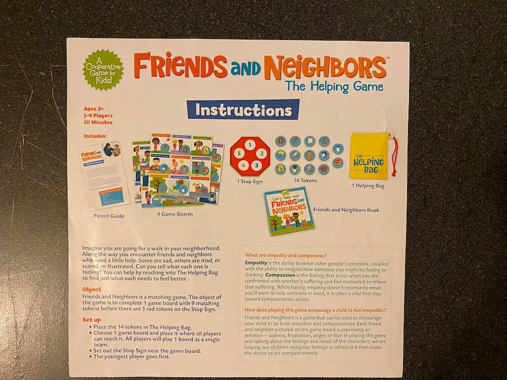 Introduce young children to the concepts of empathy and compassion with Friends & Neighbors: The Helping Game. Designed for ages 3 and up, this cooperative matching game encourages players to recognize emotions and offer help to characters in need. Through engaging gameplay and storytelling, children learn to identify feelings in others—the first step toward building emotional intelligence. Players take turns drawing tokens from the Helping Bag, each depicting an item that can assist someone on the game board. If the token matches a need—like an umbrella for a girl caught in the rain—it’s a successful match! The game also includes a storybook and parent guide to facilitate discussions about emotions and helping behaviors.