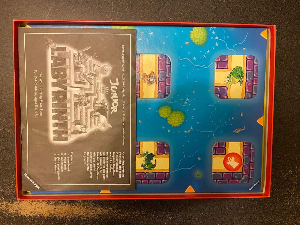 Each turn, the active player takes the free labyrinth tile and pushes it along one of the rows or columns marked with an arrow on the game board. This action inserts that tile into the labyrinth and pushes the other tiles one space, popping one tile out of the labyrinth to be used by the next player on their turn. By shifting the walls, the player hopes to be able to move his token along the paths to land on the treasure currently being sought. Playing the game helps develop planning and strategy skills. This pre-used game includes 1 Gameboard, 17 Maze Cards, 12 Secret Tokens, 4 Ghost Playing Tokens, and instructions. This game can be used by occupational therapists, speech language pathologists, and special education teachers.