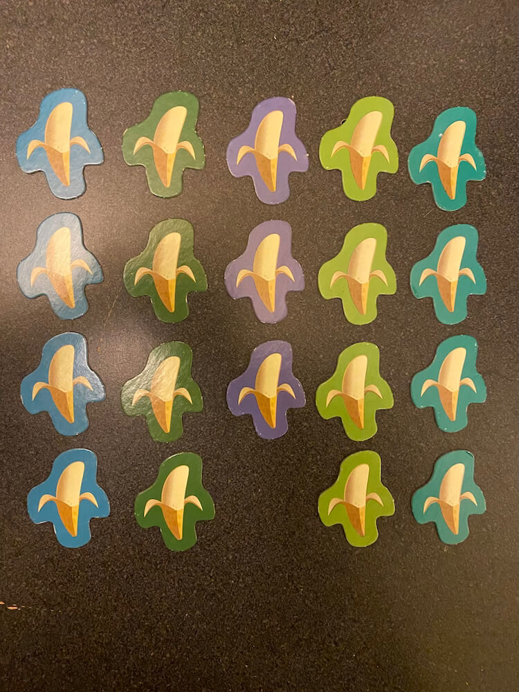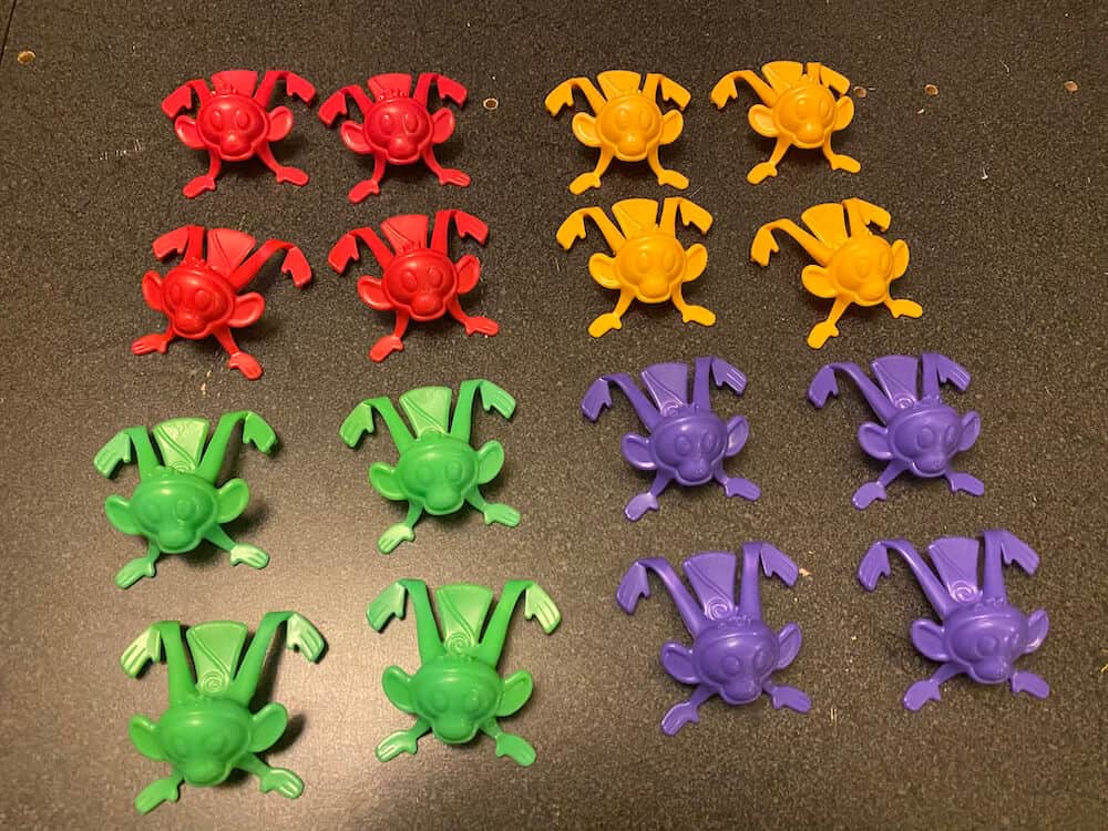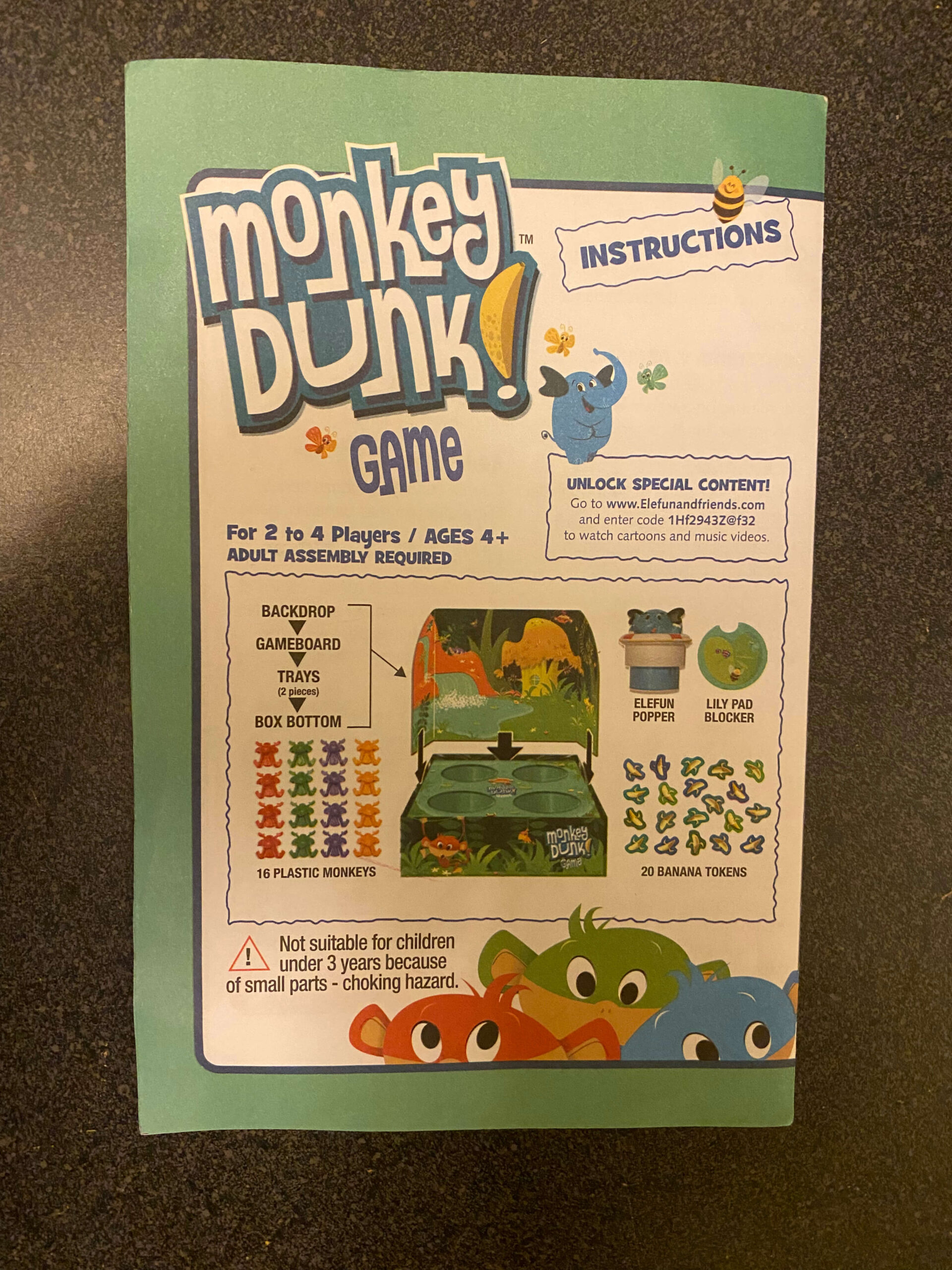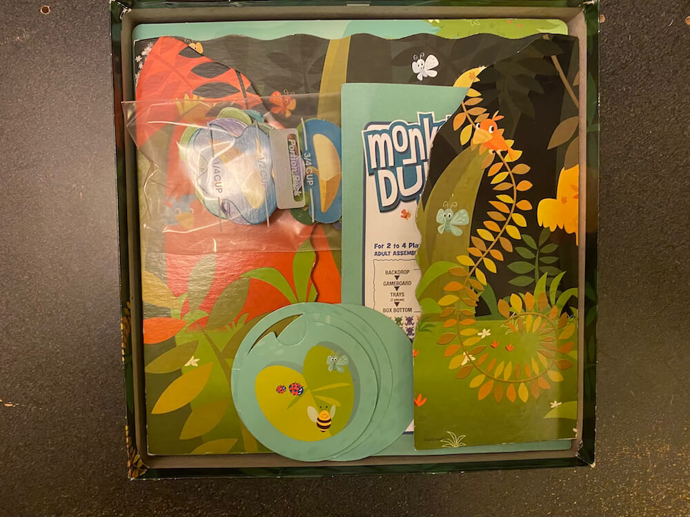 Flip the frogs into the pond. See how many monkeys you can land in the water to collect the most banana tokens. Build the lagoon with the plastic tubs and box and backdrop. Great fine-motor skill activity. This pre-used game includes 16 Monkeys (4 each of red, yellow, green, and purple), 1 Gameboard Overlay with Backdrop, 2 Plastic Bowl Halves, 19 (of 20) Banana Tokens, 1 3-piece Lily Pad Blocker, and instructions in English and Spanish. Missing the Elefun Popper. This game can be used by occupational therapists, speech language pathologists, and special education teachers.