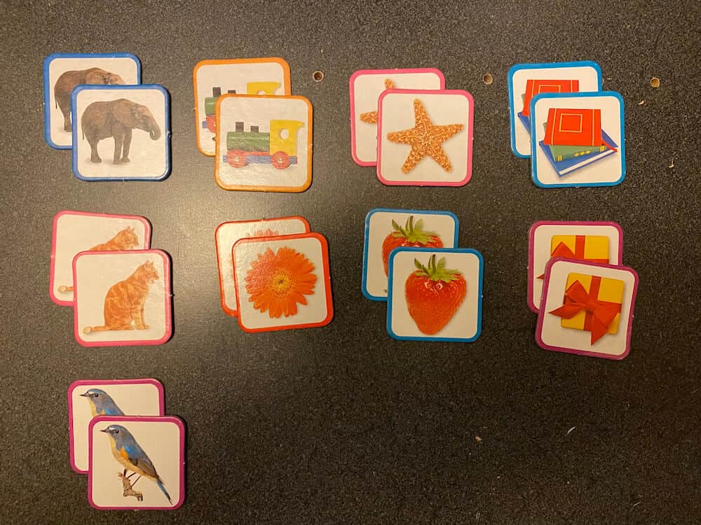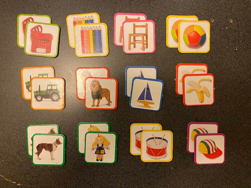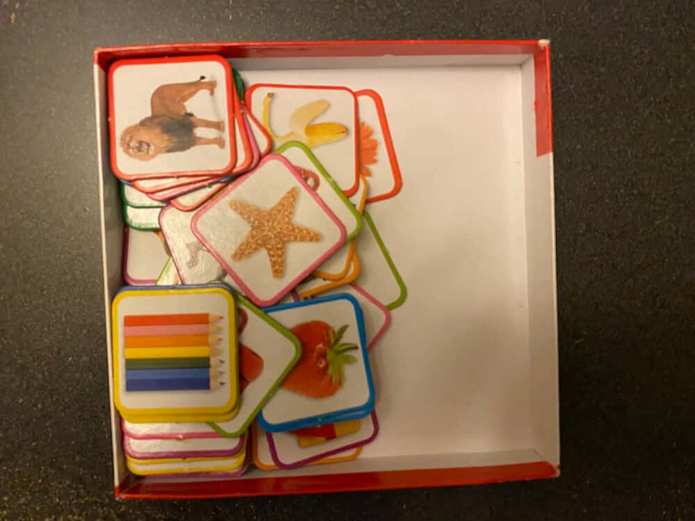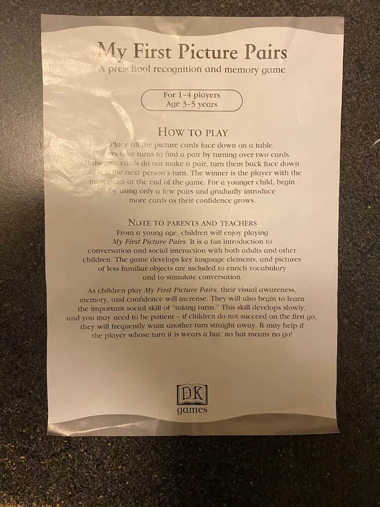 My First Picture Pairs activity from DK Games is a pre-school recognition and memory game. This activity helps develop matching and sorting skills. This pre-used activity includes 21 (of 27) Matched Pairs, and instructions. This activity can be used by occupational therapists, speech language pathologists, and special education teachers.