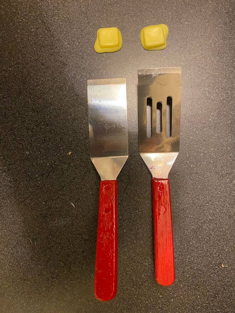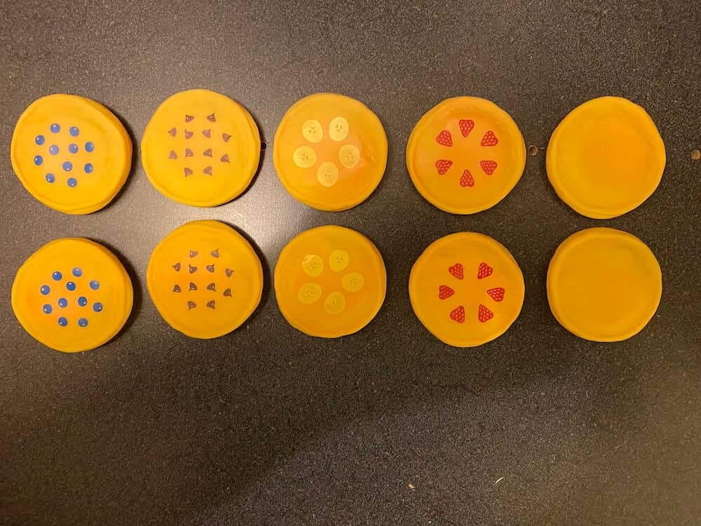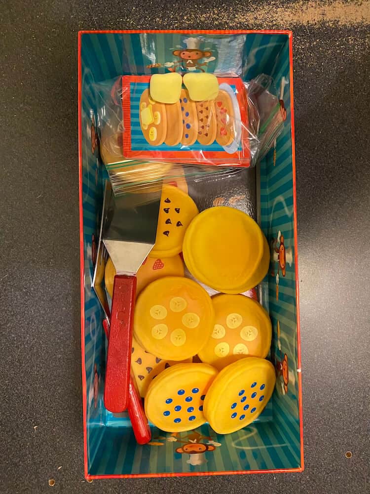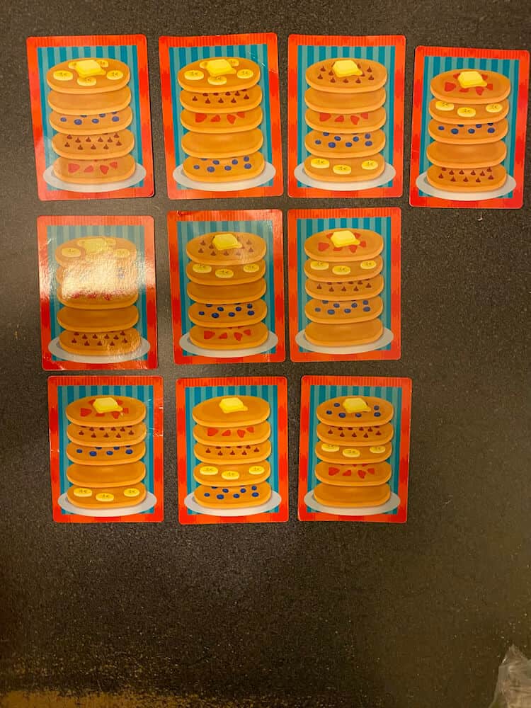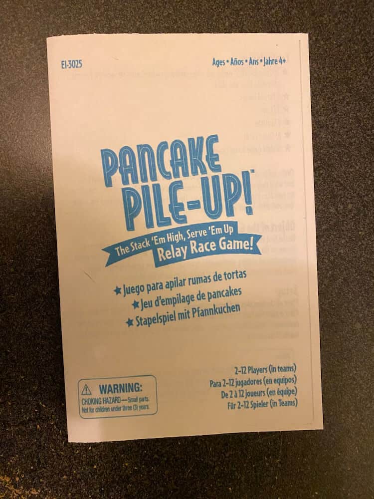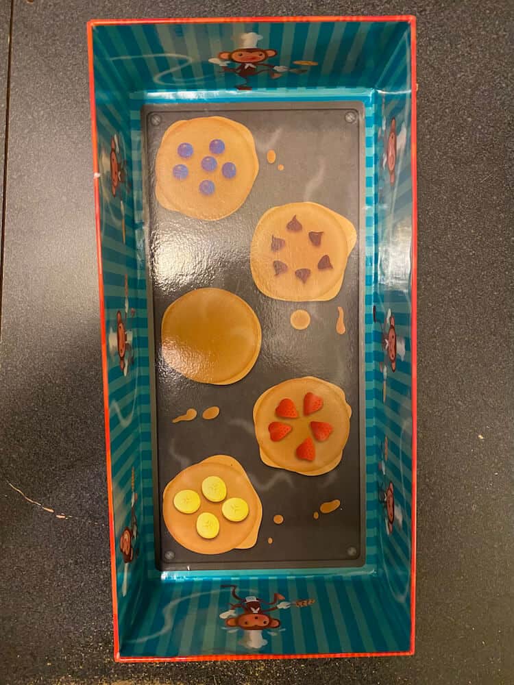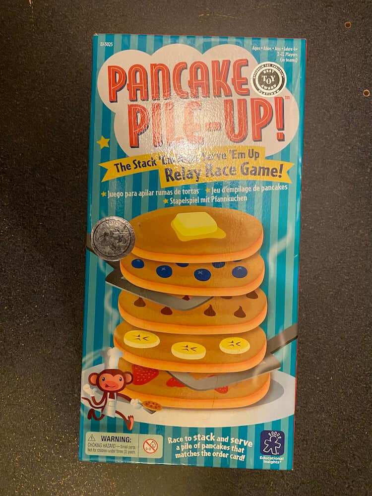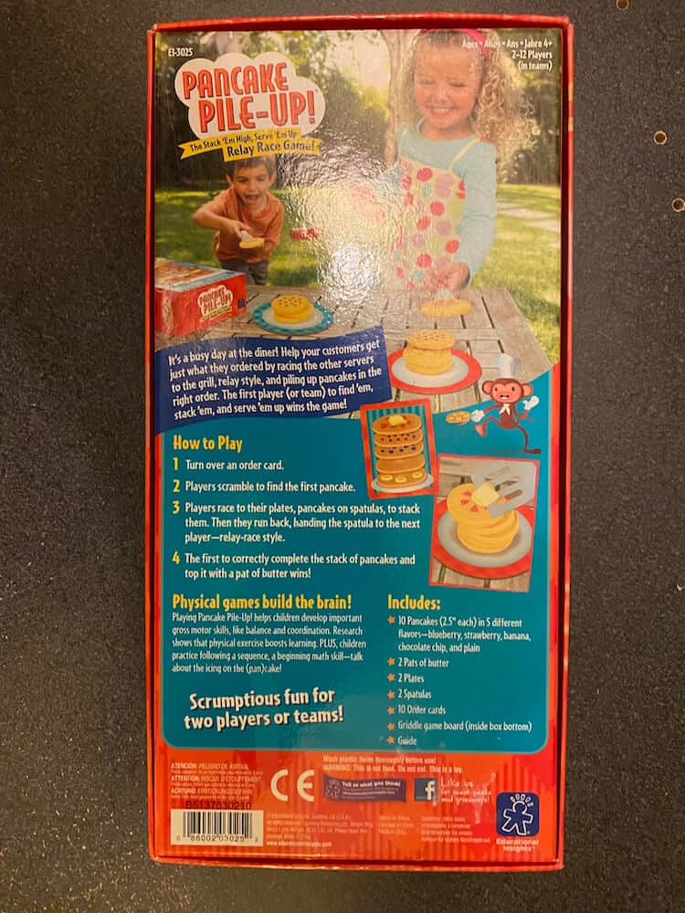 Race to stack and serve a pile of pancakes that matches your order card! Turn over an order card and find the first pancake in the stack that is pictured on the card. Race to your plate, pancakes on spatulas, to stack the pancakes. Then run back, handing the spatula to the next player, relay race style. To win, be the first to correctly complete the stack of pancakes and top it with a pat of butter. This fun game not only develops gross motor skills, balance, and coordination, but also teaches children how to follow a sequence of actions. This pre-used game includes 10 pancakes (2 ½” diameter) in 5 flavors, 2 pats of butter, 2 plates (5″ diameter), 2 spatulas (8 ” length), 10 order cards (3″ x 4″), a griddle game board (inside of box bottom) and instructions in English, Spanish and German (photocopy). This game can be used by physical therapists, occupational therapists, speech language pathologists, and special education teachers.