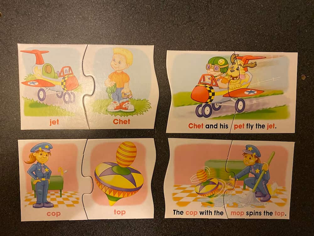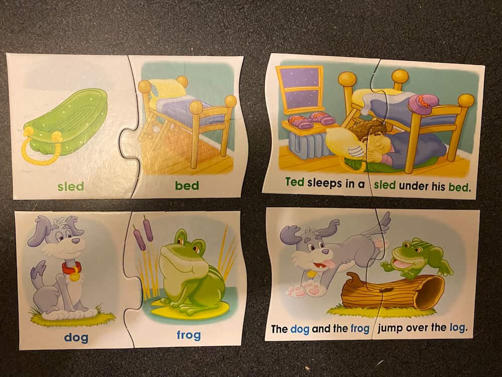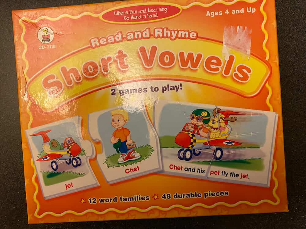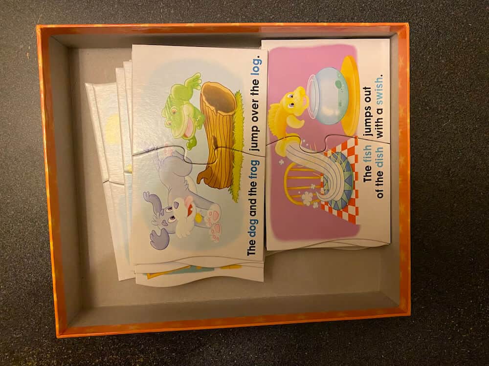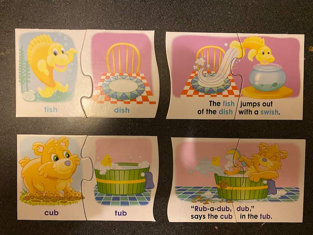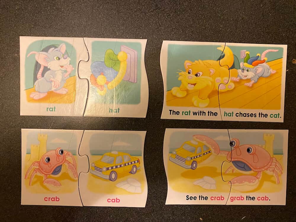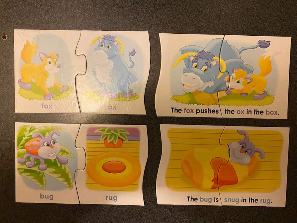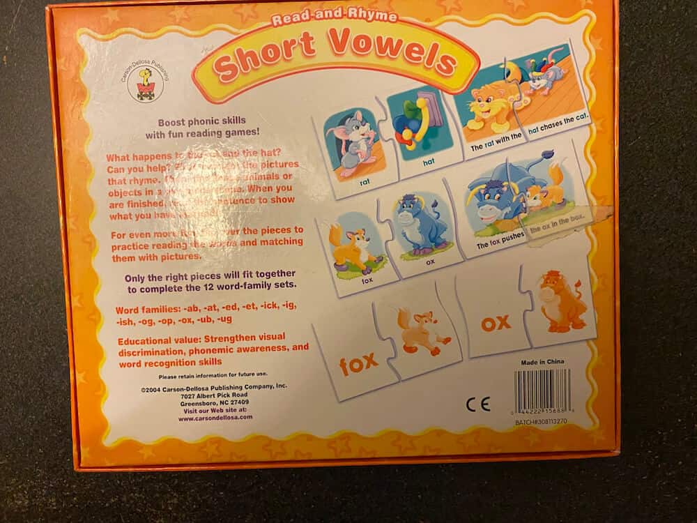 Self-correcting puzzles showing rhyming pairs and a matching pair illustrating the rhyming words in a sentence. Boost phonic skills with fun reading games. Includes 12 word families: -ab, -at, -ed, -et, -ick, -ig, -ish, -og, -op, -ox, -ub, and -ug. This pre-used game includes 48 Puzzle Pieces (24 matching pairs). This game can be used by occupational therapists, speech language pathologists, and special education teachers.