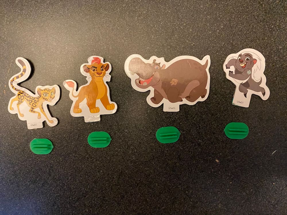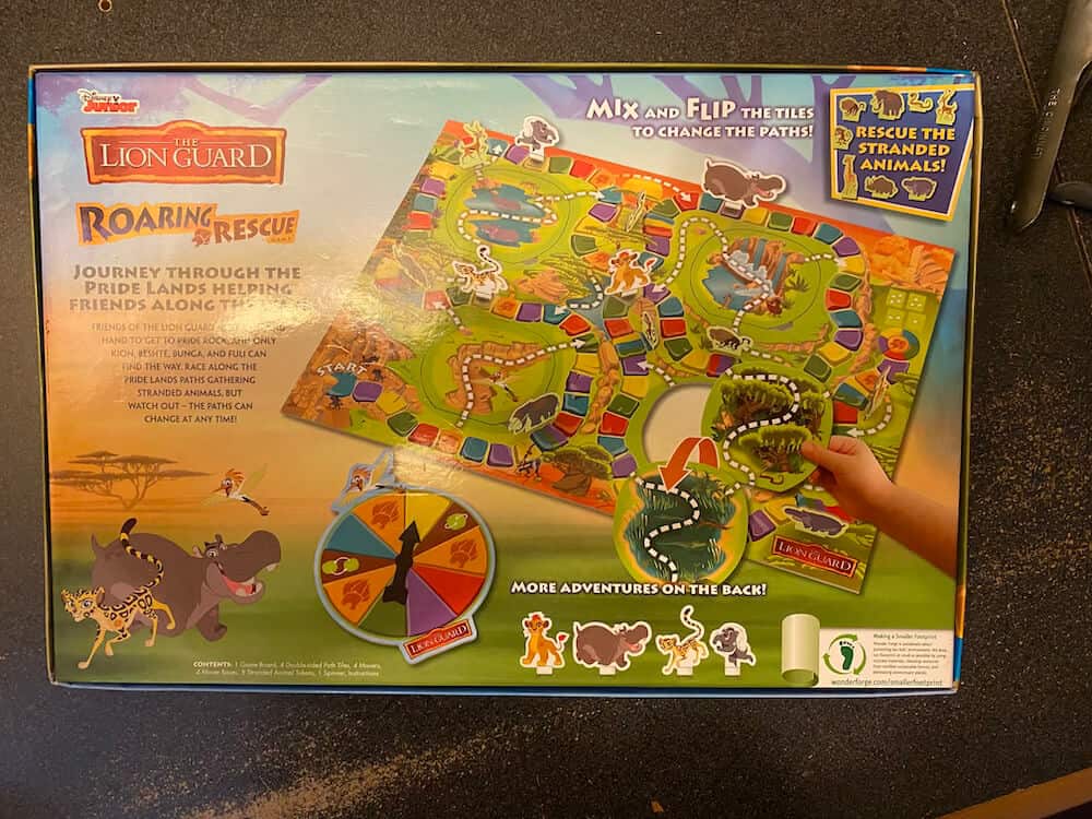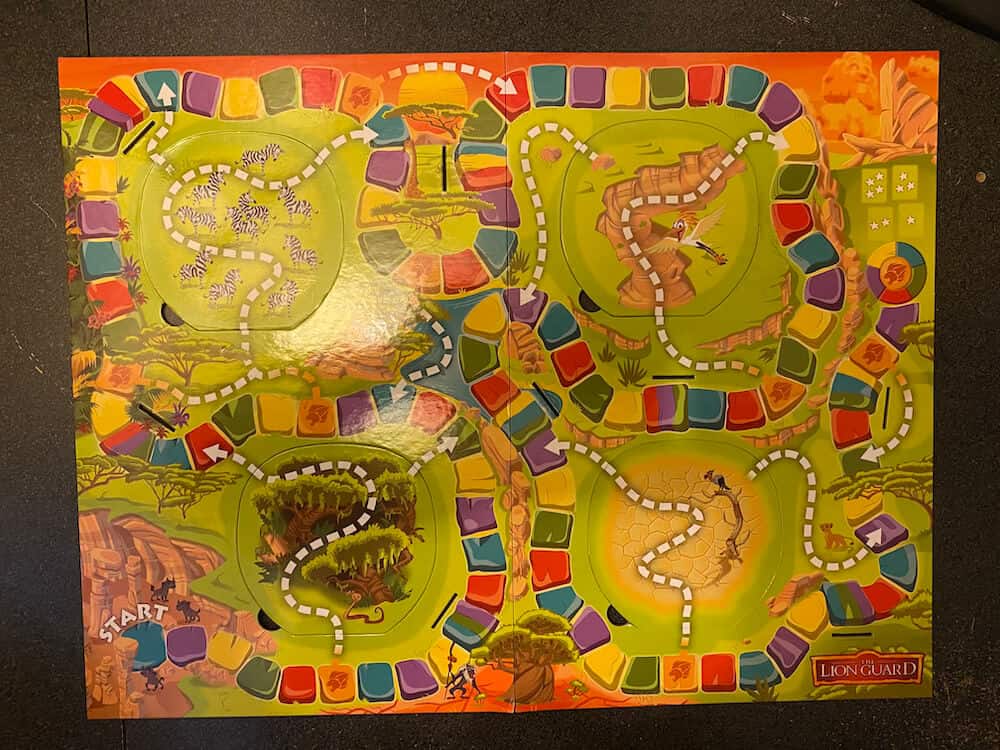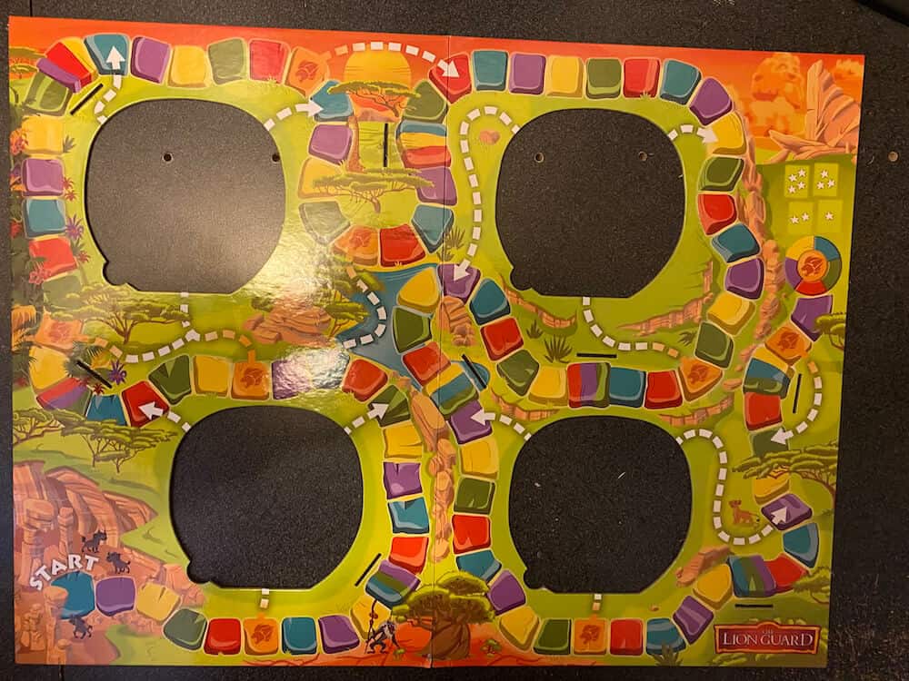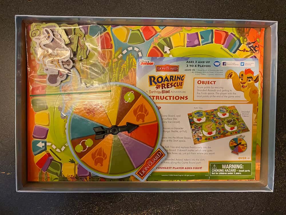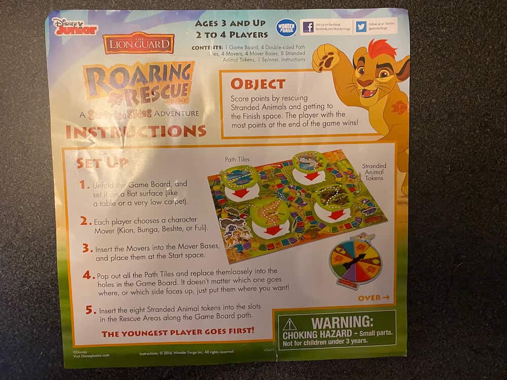 Friends of the Lion Guard need a helping hand to get to Pride Rock, and only Kion, Beshte, Bunga and Fuli can find the way. Race along the Pride Lands’ paths, gathering stranded animals, but watch out – the paths can change at any time! Score points by rescuing Stranded Animals and getting to the Finish space. The player with the most points at the end of the game. Roaring Rescue is a simple spin and move game. This pre-used game includes 1 Gameboard, 4 Double-sided Path Tiles, 4 Mover Animal Tokens, 4 Mover Bases, 8 Stranded Animal Tokens, 1 Spinner, and instructions. This game can be used by occupational therapists, speech language pathologists, and special education teachers.