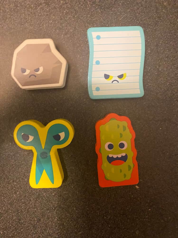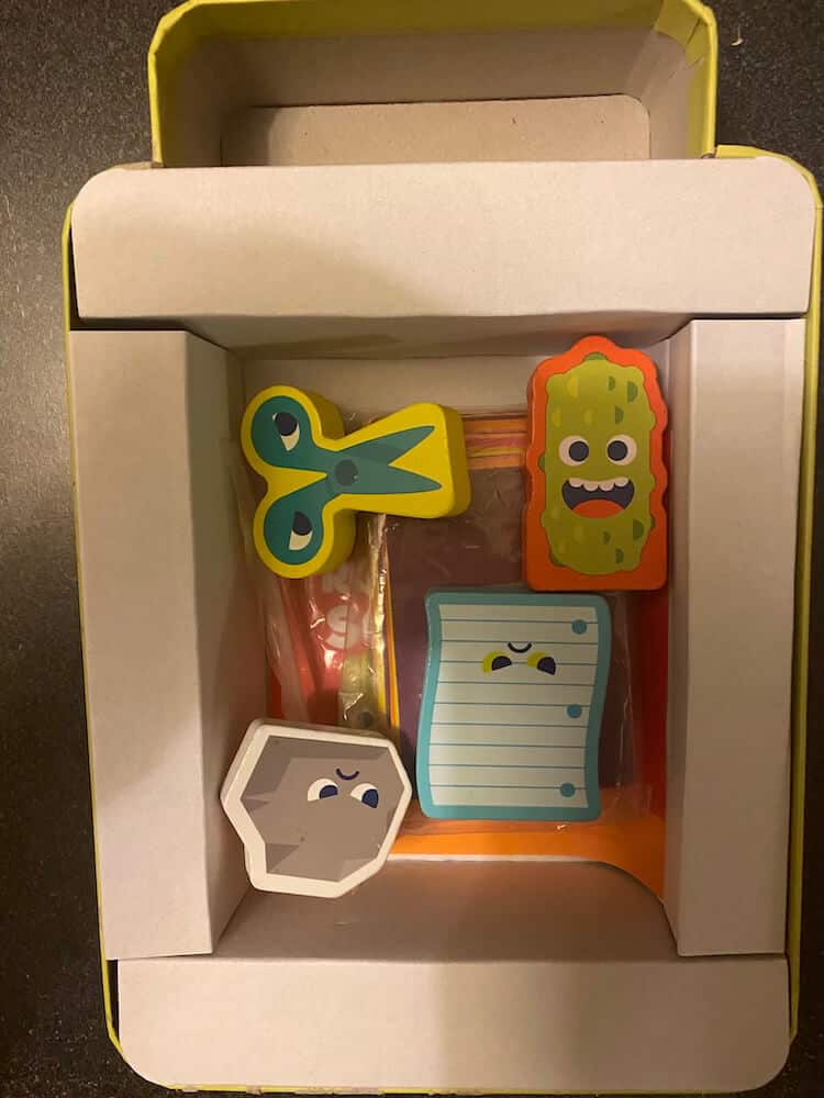 Put the super-cute Rock, Paper Scissors, Pickles wooden pieces in the center of the table then deal the cards evenly to each player. The deck of cards has rock, paper, scissors, and pickle cards in it, and background colors are either orange, green, purple, or pink. Everyone keeps a stack of cards in front of them and on their turn they flip a card. If the card that’s flipped has a background color that matches any of the other cards on the table, the race is on! Players must grab whichever item on the two matching cards wins the classic rock, paper, scissors battle. Got a pickle in the mix? That crunchy green cuke beats them all! Playing this game allows kids to practice basic logic, color matching & quick reflexes.