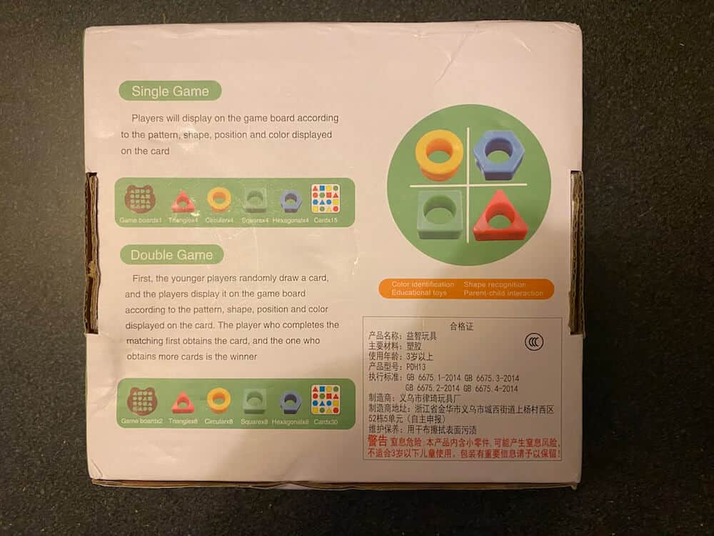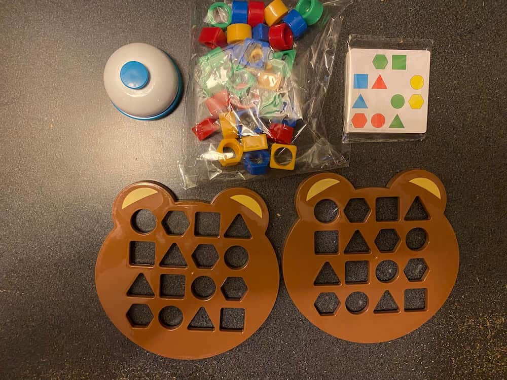 Great shape matching game for toddlers. Match the shapes on the card buy putic the plastic pieces in the grid. When you finish the pattern, ring the bell. This game helps improve hand-eye coordination, boosts creativity, critical thinking and color recognition. This pre-used game includes 2 Plastic Grids, 32 Plastic shapes in red, yellow, blue, and green (triangles, circles, squares, hexagonal shapes), 30 Pattern cards, and 1 Bell. This game can be used by occupational therapists, speech language pathologists, and special education teachers.
