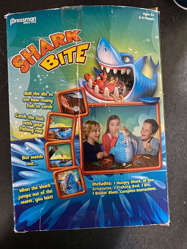 Get ready to have a Reel-y good time when you play Shark Bite! Snag the fish and be the winner, but if the shark jumps, you’ll be his dinner! Place the fun and colorful sea creatures into the game unit with a snap, and grab your friends to start playing. Players take turns rolling the die and fishing for the sea creatures using the fishing rods. But watch out – you never know when the shark is going to bite! This pre-used game includes 1 Hungry Shark, 12 Sea Creatures, 1 (of 2) Fishing Rods. 1 Custom Die, and instructions. This activity can be used by occupational therapists, speech language pathologists, and special education teachers.