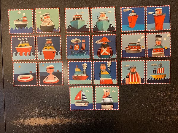 Ships and Captains Memory and Matching game from Hungary. Does the ship look like its captain, or the captain like his ship. Compare the colors and shapes to identify which captain is paired with which ship. Play as a traditional matching game, turning over cards two at a time, but the matches are not exact matches of pictures. The match is determined by comparing colors, shapes, and patterns. This pre-used game includes 20 thick cardboard tiles (10 matching sets).