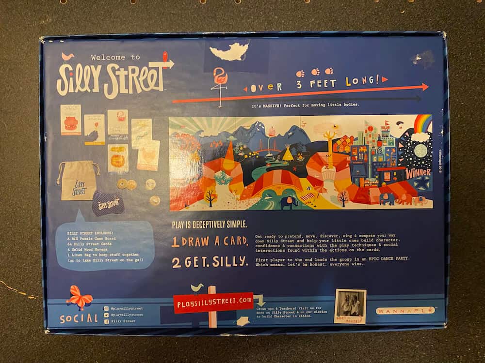 In Silly Street, you be faced with things like inventing stories about little characters in silly situations, finding and interpreting things on the board, contests between players and dramatic reenactments of animals doing zany things. Howl like a wolf and move 4 spaces. Find animals on the board that hatch from eggs – move one space for each animal you found. Some of the cards strengthen academic skills (counting, spelling, memorization), but most of them are about building character. Players will build confidence, use their imaginations, and adapt to changing circumstances. This pre-used game includes 1 Big Puzzle Gameboard (over 36″ long), 64 Silly Street Cards, 4 Solid Wood Movers, 1 Linen Bag (for storage), and instructions (bottom of box) and Parents Guide. This game can be used by physical therapists, occupational therapists, speech language pathologists, and special education teachers.