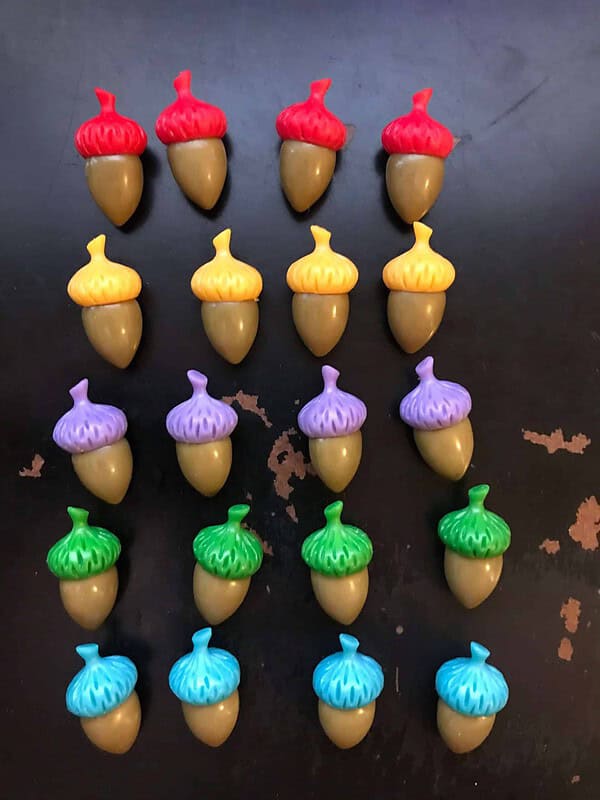 This game contains 1 Squirrel Squeezer, 1 Game Spinner, 20 Acorns (4 each of yellow, green, blue, red, purple), 4 Logs, and instructions. This game encourages fine motor development, direction following matching colors. It encourages social skills and turn taking. Incorporate vocabulary and articulation cards to improve speech and language skills. This game can be used by occupational therapists, speech language pathologists, and special education teachers.