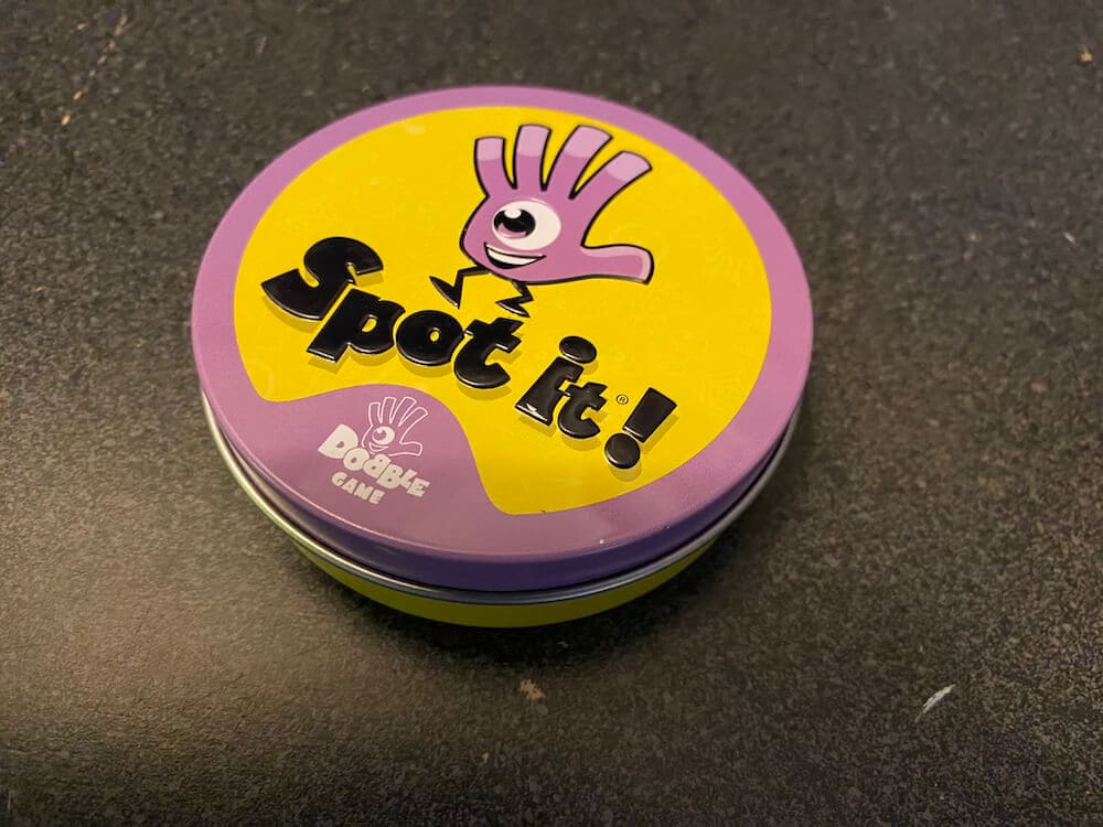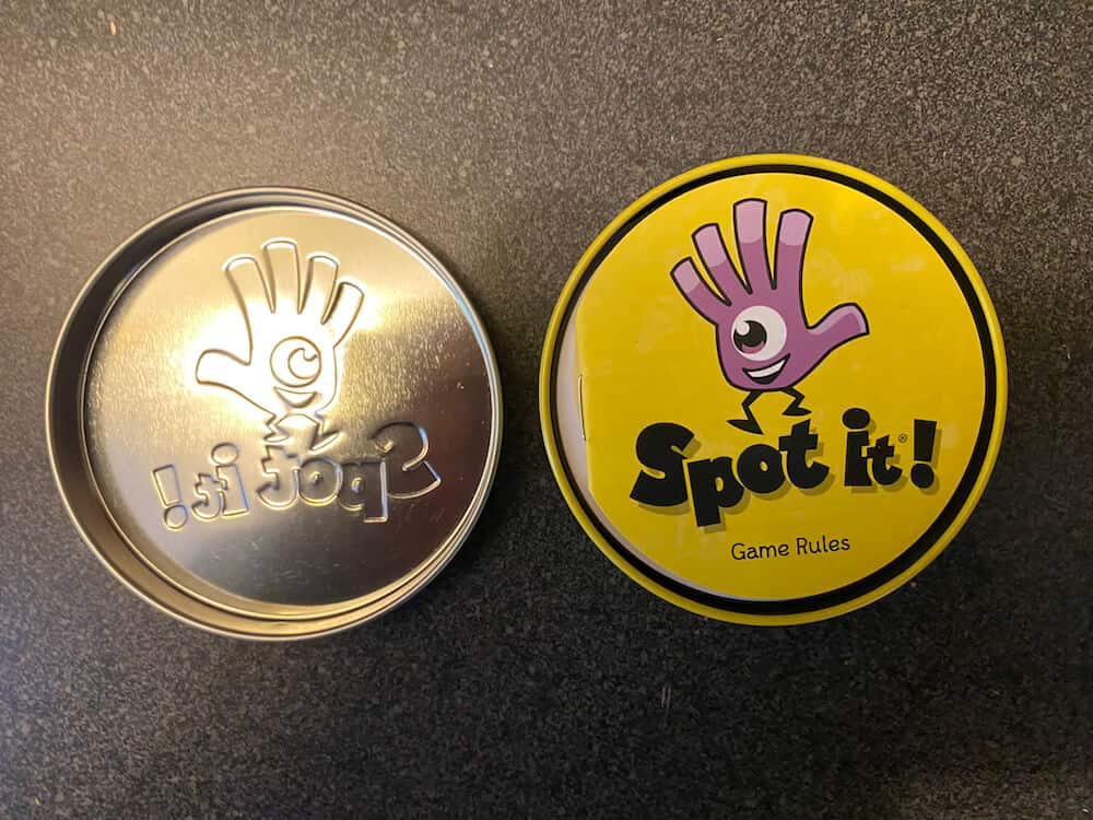 Great matching game in a handy metal tin. Each card in original Spot it! features eight different symbols, with the symbols varying in size from one card to the next. Any two cards have exactly one symbol in common. For the basic Spot it! game, reveal one card, then another. Whoever spots the symbol in common on both cards claims the first card, then another card is revealed for players to search, and so on. Whoever has collected the most cards when the 55-card deck runs out wins!