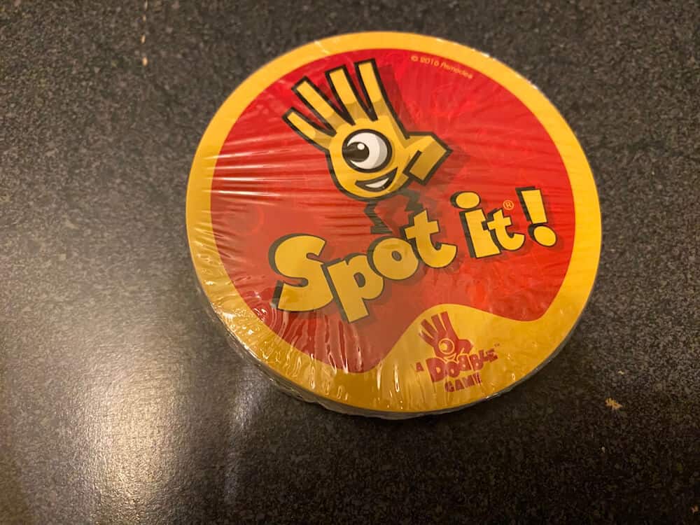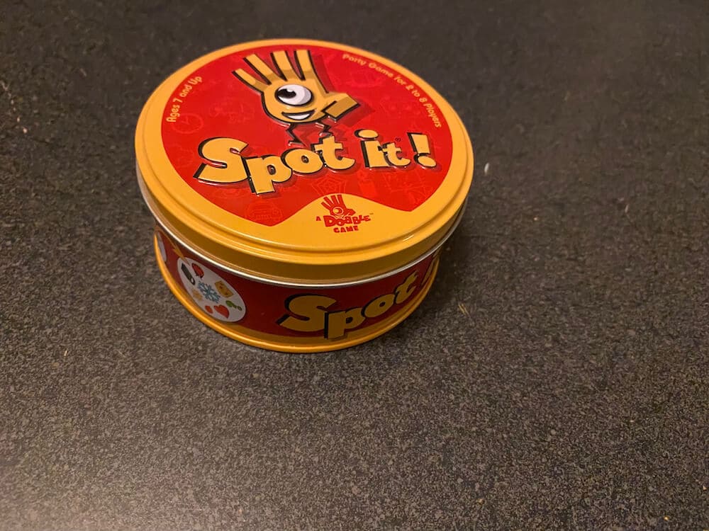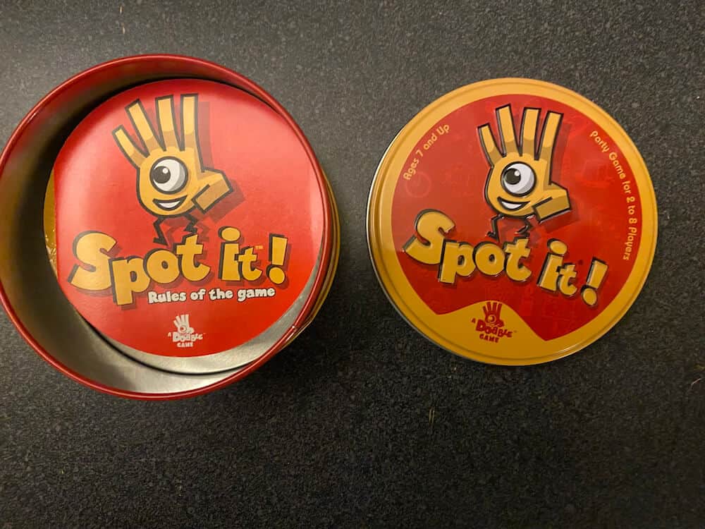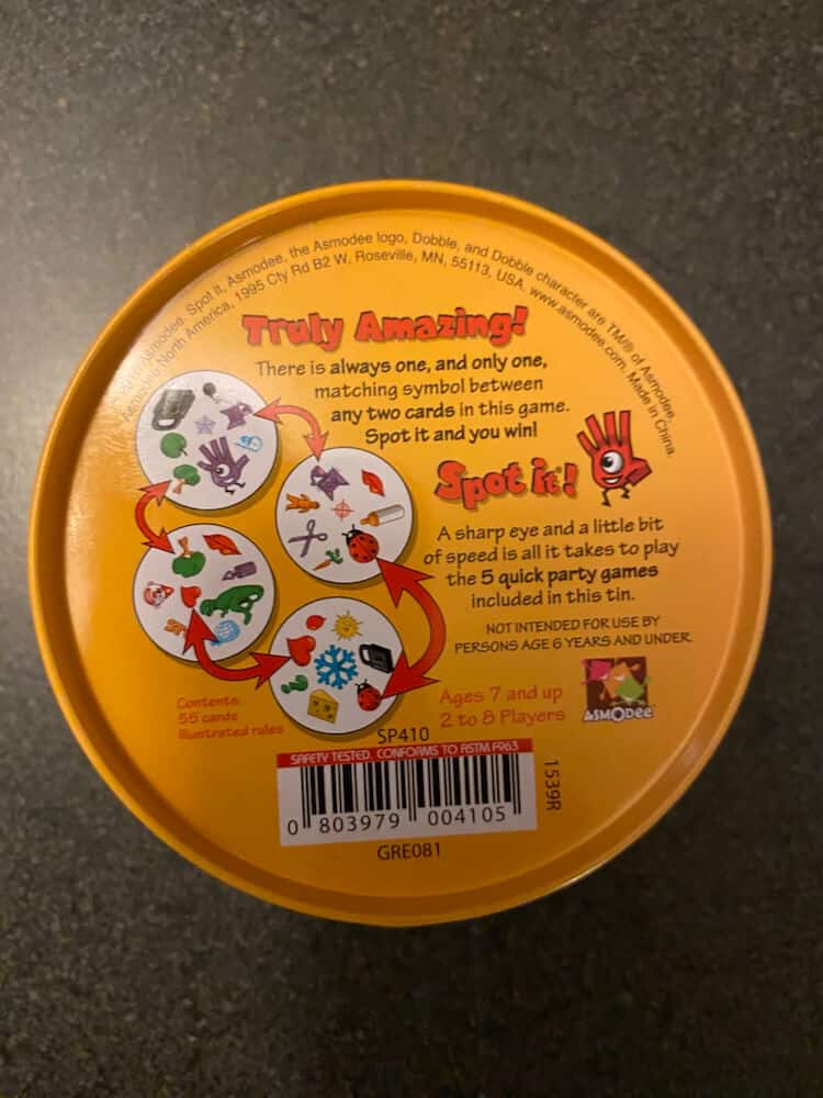 Great matching game in a handy metal tin. Each card in original Spot it! features eight different symbols, with the symbols varying in size from one card to the next. Any two cards have exactly one symbol in common. For the basic Spot it! game, reveal one card, then another. Whoever spots the symbol in common on both cards claims the first card, then another card is revealed for players to search, and so on. Whoever has collected the most cards when the 55-card deck runs out wins!