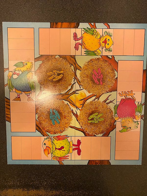In this children’s game, players compete to create either the tallest or shortest birds, adding cards that show either a bird’s head or its feet to the bird bodies on the gameboard.