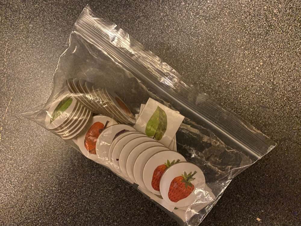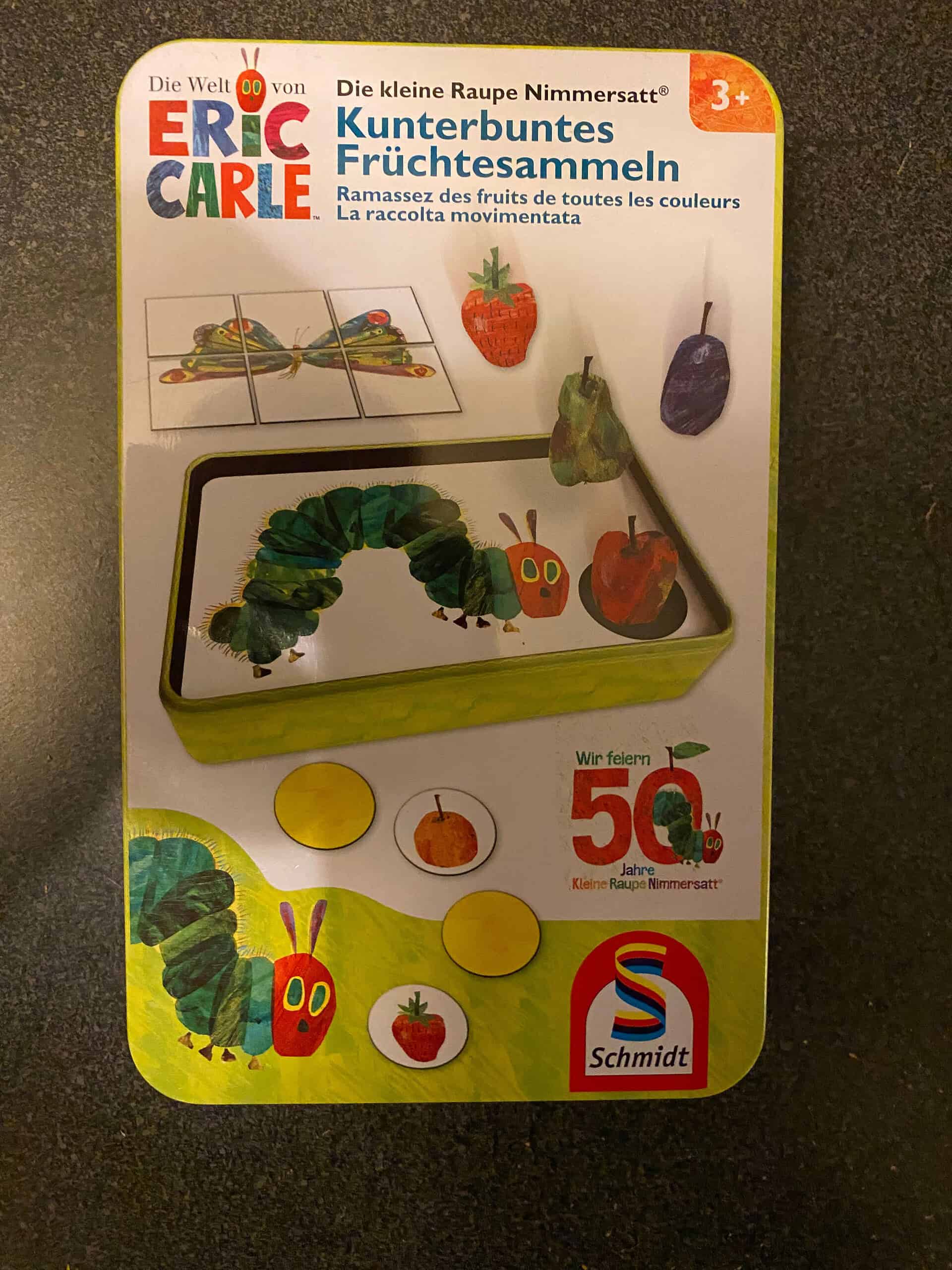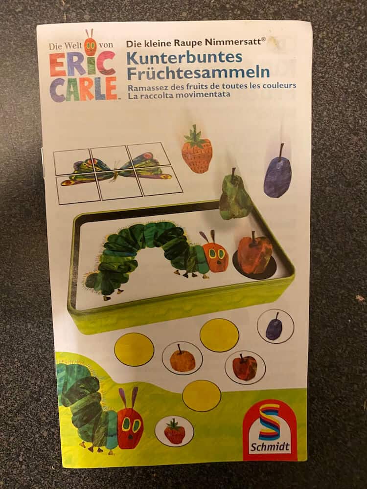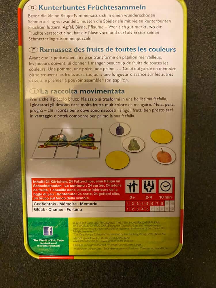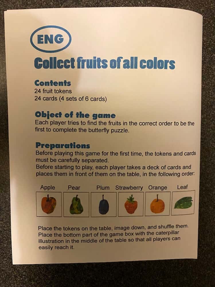 Each player tries to find and feed the fruits caterpillar in the proper order. When it’s your turn, you first try to find an apple among the hidden tokens. Turn over one of the chips that are on the table. If you turn over an apple, you can give it as food to the caterpillar. On your next turn, you will seek a pear, then a plum, and so on. Continue in this way to find, little by little, the food for the caterpillar in the proper order. The first player who have turned over all six cards wins the game. This pre-used game includes 24 Fruit Tokens, 24 Cards (4 sets of 6 Butterfly cards), 1 Caterpillar Cutout (for feeding), 1 Tin Storage Box (4.5″ x 7.5″ x 2″), and instructions in English (photocopy) and German, French, and Italian. This game can be used by occupational therapists, speech language pathologists, and special education teachers.
