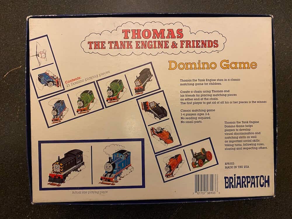 Thomas the Tank Engine & Friends are on full display in this domino game. The pieces are made of thick, durable cardboard ideal for small hands, showing two of Thomas’s friends on each card. The game can be played as a memory game similar to concentration, or a simple matching game, or as a traditionalgame of dominoes. The game helps develop memory, color and shape recognition. This pre-used game includes 21 Domino Tiles, 3 Blank Domino Tiles, and instructions. This game can be used by occupational therapists, speech language pathologists, and special education teachers.