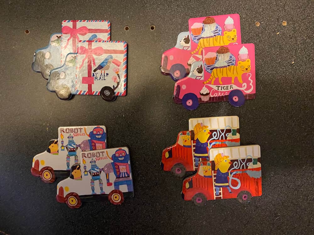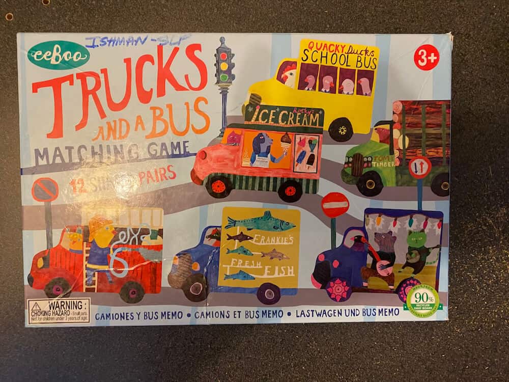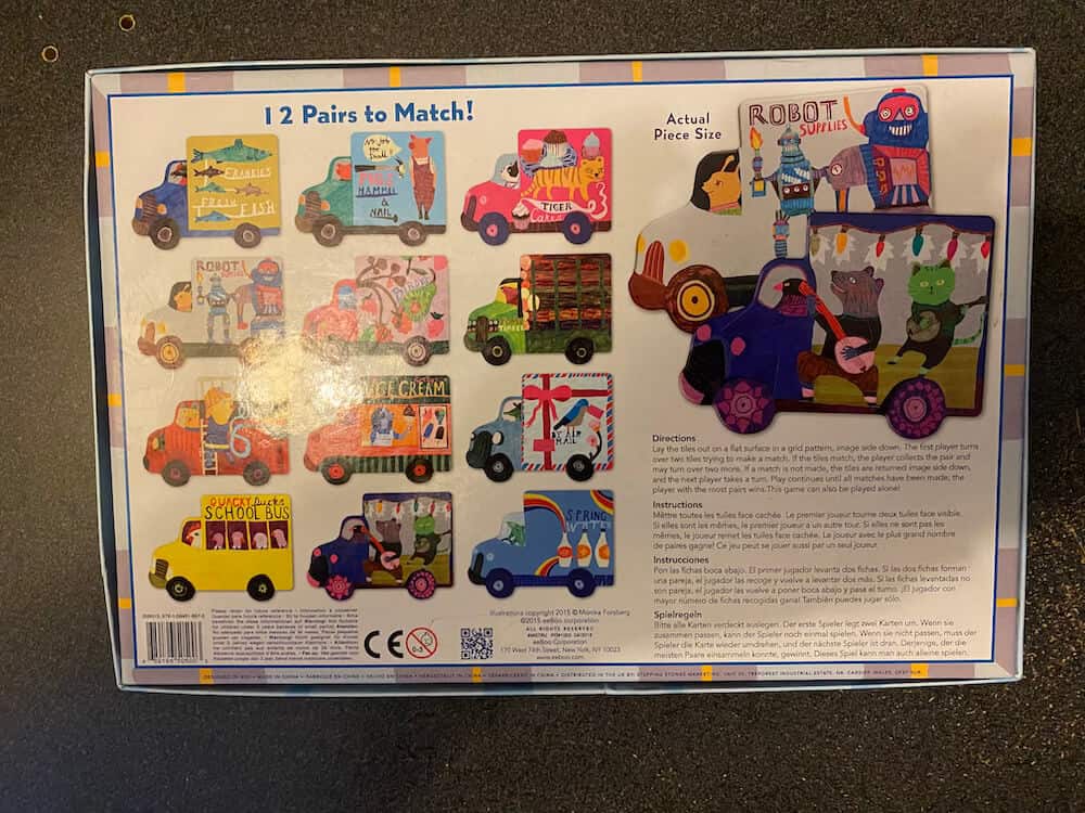 eeBoo’s Trucks and a Bus Memory & Matching Game re-envisions the classic memory game with quirky illustrations by acclaimed artist, Monika Forsberg. Played by placing each piece face down and then flipping them over to try to locate matching pairs. Memory games fine-tune concentration, cooperation, and memory skills. Each set includes playing pieces shaped like trucks, making it a fun activity for those with small hands. This pre-used game includes 20 (of 24) Matching Pairs. This game can be used by occupational therapists, speech language pathologists, and special education teachers.