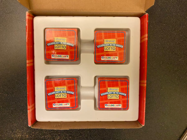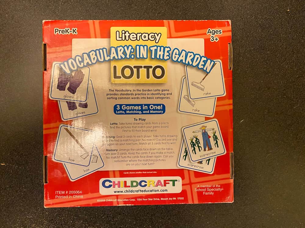 Literacy Lotto Vocabulary: In the Garden game uses common vocabulary words along the theme of gardening. Great for building vocabulary while playing memory and matching games and sorting common words into categories. This game has three games in using these gameboards and cards. This pre-used game includes 4 Sturdy Lotto Gameboards, and 18 Pairs of Picture Cards. This game can be used by occupational therapists, speech language pathologists, and special education teachers.