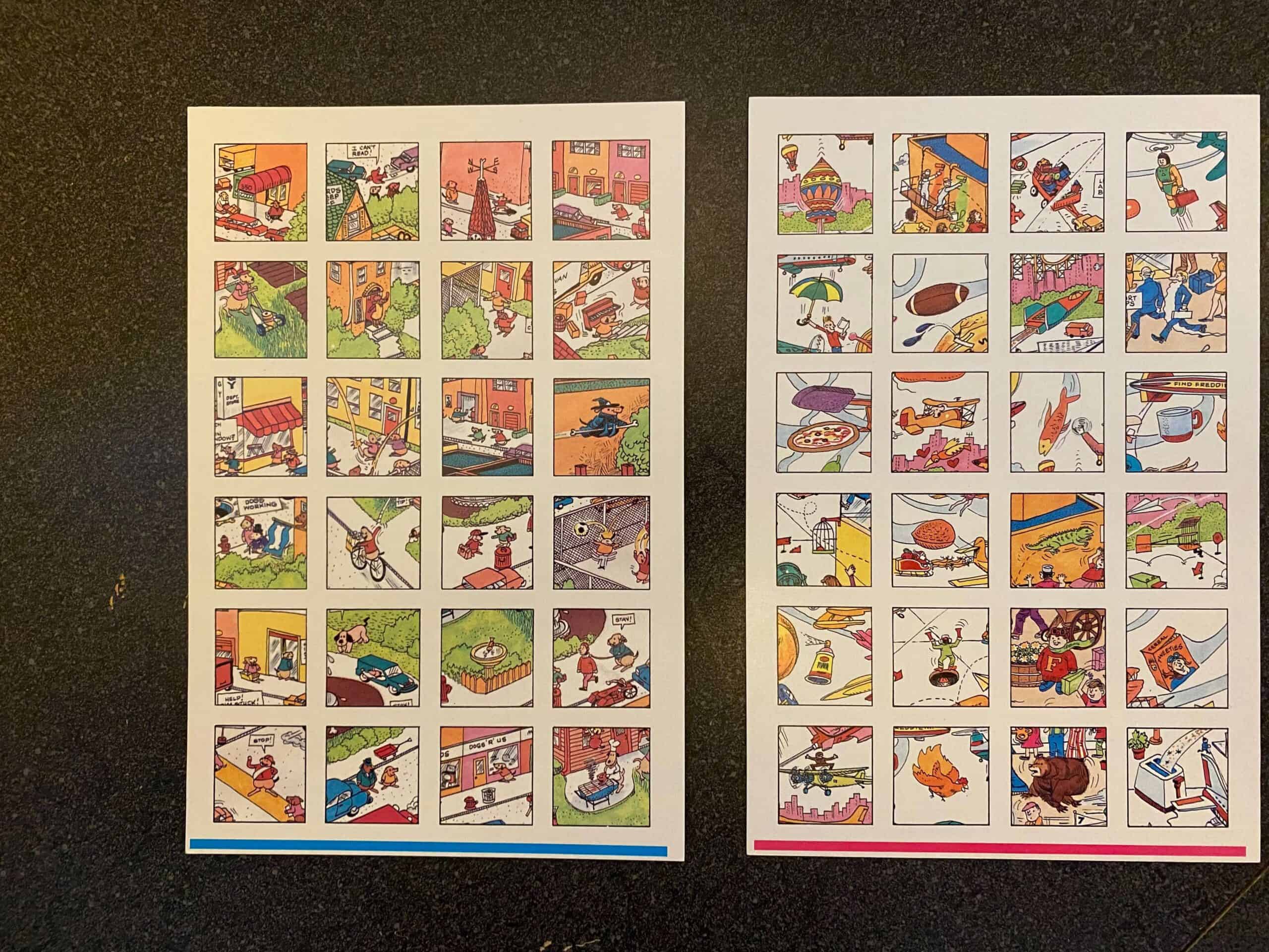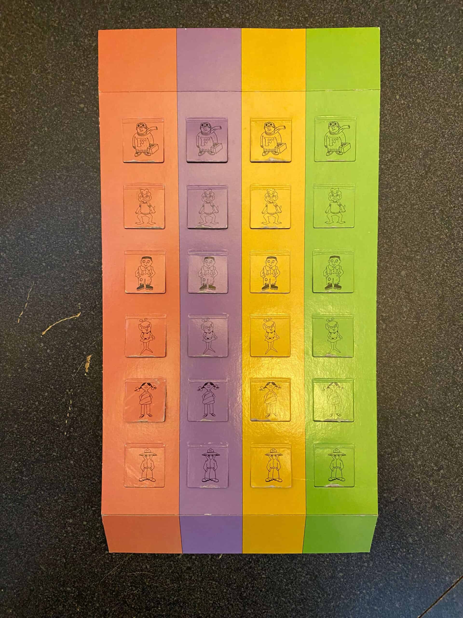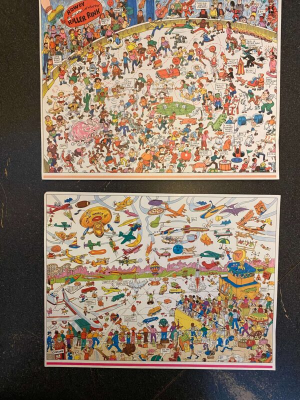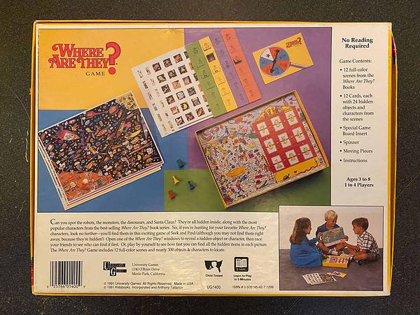 Hard-to-find, vintage searching game. Can you spot the robots, the monsters, the dinosaurs, and Santa Claus? They’re all hidden inside, along with the most popular characters from the best-selling Where Are They? book series. So, if you’re hunting for your favorite Where Are They? characters, look no further — you’ll find them in this exciting game of Seek and Find. Open one of the Where Are They? windows to reveal a hidden object or character, then race your friends to see who can find it first. Great for visual acuity and attention to detail. This pre-used game includes 6 full-color, 2-sided scenes from the Where Are They? books, 6 full-color, 2-sided cards, each with 24 hidden objects and characters from the scenes, 1 gameboard, 1 special gameboard insert with 24 liftable flaps, 1 spinner, 4 moving tokens, and instructions. This game can be used by physical therapists, occupational therapists, speech language pathologists, and special education teachers.
